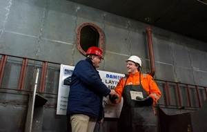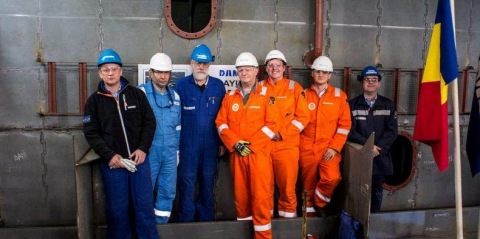 02 Dec 2014 New-build Damen Offshore Carrier 8500 Reaches Key Stage Maersk Supply Service, DeepOcean UK and Damen have held the keel laying ceremony of Maersk Supply Service’s new subsea support vessel at Damen Shipyards Galati (Romania). On Wednesday, November 12th, a key milestone was achieved in the progress of the new-building project, when the formal keel laying ceremony took place at Damen Shipyards Galati. In keeping with shipbuilding tradition, a commemorative plaque incorporating 3 special coins was welded to a corridor section of building block number 116. The ceremony was attended by the shipyard workforce attached to the project, alongside representatives from Damen, Maersk, DeepOcean and Lloyd’s Register, who certified the milestone achievement. Carsten Plougmann Andersen, CEO of Maersk Supply Service, said: “Keel laying of this vessel is the very physical evidence of Maersk Supply Service strengthening our position in the Sub Sea Support vessel market. We are looking very much forward to continuing the good cooperation with all involved parties to achieve delivery in February 2016.” Remko Bouma, Damen Sales Manager adds: “The ceremony is an important milestone which we have reached on time. It shows our commitment to the agreements. Considering the way we have worked together so far, we are confident that we will deliver the DOC 8500 Cable Layer in time.” “This next generation cable lay vessel in combination with our survey and trenching capabilities will enable us to bundle our services for customers in the offshore power cable and umbilical markets. The versatile new vessel will be well suited for installation and burial projects using its 7,000 tonne carousel from land-fall to deepwater and also in remote geographical locations. The vessel is designed to meet the high standards demanded by North Sea Oil and Gas customers. We are delighted to be working with Maersk Supply Service and Damen to bring this high capability vessel to the market,” Tony Inglis, DeepOcean UK managing director ends. Damen Shipyards Group press release |