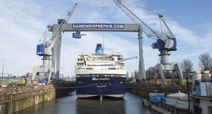 Damen’s scope included repairs to the deck steel work and a comprehensive overhaul of the lifeboats and their davits. Further work included general repairs to the vessel’s piping, electrical and hydraulic systems. Damen Shiprepair Rotterdam used its biggest dry dock – the 307 metre number 8 dock – to house the Saga Sapphire during the repair works. Whilst in Rotterdam, the Saga Cruises-owned vessel also underwent a scheduled DNV GL Class Survey. “Part of this involved inspecting the vessel’s 12 metre long propeller axle,” informs Mr Ippel. “On a big project like this, comprising 224 planned items that included over 600 separate tasks, efficient communication is of the essence. It goes without saying that this includes good communication with the client,” continues Mr Ippel. “It was a complicated and challenging job but it is great to see another cruise ship repair project finished on schedule.”