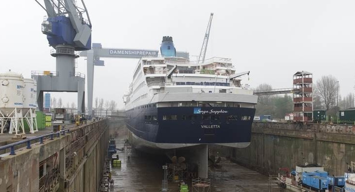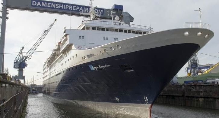 Saga Sapphire heads to the Canaries after successful repair and refurbishment works at Damen Shiprepair Rotterdam 12 Jan 2015 19 December, the Saga Cruises-owned Saga Sapphire left Damen Shiprepair Rotterdam (part of Damen Shiprepair & Conversion) after receiving extensive repair and refurbishment works as well as a scheduled Class Survey. The 199.63 metre vessel is now back in action, picking up passengers from Dover before heading for the Canary Islands in time for Christmas. This latest contract signifies a period of back-to-back cruise ship repair projects that also includes work carried out on a 300 metre vessel that left the yard last month. As is customary with cruise ship repair projects, the Saga Sapphire contract involved a tight time frame that required precision planning from Damen’s project management team. “Considering the time frame and the age of the vessel, this was a challenging refurbishment project”, says Damen Shiprepair & Conversion’s Cruise Vessels Product Manager Khalil Benjelloul. “But we completed the work successfully in the scheduled 19 days. With Damen’s own personnel and subcontractors working to such a tight schedule, an important issue with this project was an efficient interface between tasks.” “It’s all about good planning,” says Paul Ippel, Area Sales Manager/ Project Manager at Damen Shiprepair & Conversion. “We broke the whole project down into a step-by-step programme. The team was headed by four project leaders, each with his own area of responsibility.” The most challenging item on Damen’s to-do list was replacing the vessel’s two sewage plants. “To get to the sewage plant, we had to go through the hull and the engine room bulkhead,” informs Mr Ippel. “This involved a lot of coordination between various sub-contractors.”