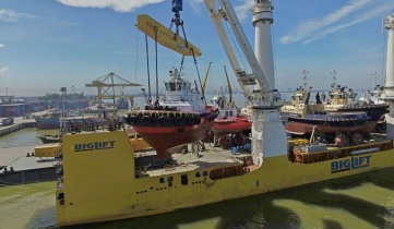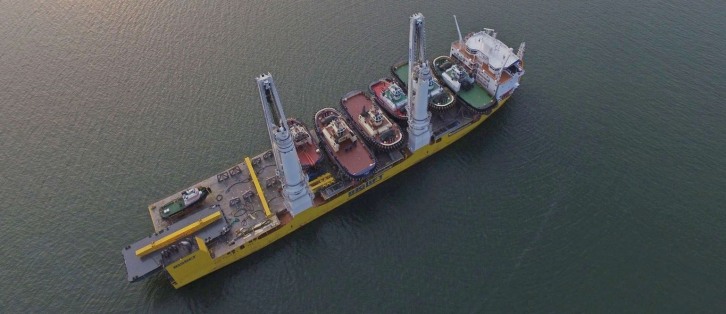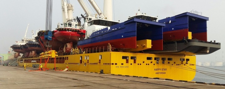 Damen has already sold a number of the vessels being transported. Amongst these are two Fast Crew Suppliers (FCS) 2610 to be used at North Sea offshore wind parks. The transport is a welcome opportunity to accommodate the requirements of clients on the west coasts of Africa and Europe looking for smaller tugs and pontoons. By having a global spread of strategic stock available, Damen always ensures short delivery times of popular vessels. The scope of the transport was derived with a close eye on the needs of clients in Scandinavia, Western Europe and Africa. Rimmert Berlijn, Damen Service Coordinator Heavy Lift, explains: “We took a lot of time to carefully consider what vessel types we would transport, and in what numbers, in order to best serve the requirements of a wide range of clients.” Following the initial loud-out and embarkation from Shanghai, the transport made calls at the Vietnamese ports of Hai Phong and Da Nang and at Singapore to collect additional vessels. Included in the transport are Damen ASD Tugs 2310, 2411 and 3212, Stan Tugs 1606, 1004 and 1907, Stan Pontoons 5213 and 3011 and the above mentioned FCS 2610 vessels. As a result of this large-scale, multiple vessel transport, clients active in various industries such as fish farming, heavy lifting, contracting work, harbour assistance and dredging will benefit from reduced shipping costs. The Damen stock-vessels are ready for operation, though they can still be outfitted with client specific options. Upon arrival in Europe, the vessels will receive final touch-ups and cleaning before delivery to clients or distribution to various Damen shipyards. Damen Service Coordinator Deliveries John Slijkoord explained Damen’s selection of BigLift for the project, saying, “As soon as we got the completed scope we put it out on the market with our requirements– BigLift met all of these.” The heavy-lift specialist operates a fleet of fifteen vessels. Happy Star is equipped with two 900 tonne heavy-lift mast cranes, 3,280 m2 of unobstructed deck space, and a weather deck with pontoon hatch covers extending the full length of the ship.