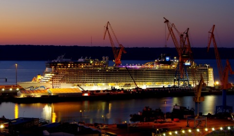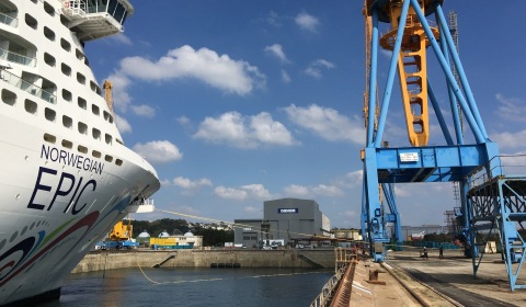 12 October 2015 On Sunday, 27 September, Norwegian Cruise Line’s cruise vessel, Norwegian Epic, entered Damen Shiprepair Brest for a scheduled refit and maintenance programme. The vessel will remain in Brest’s largest drydock until 18 October. The yard, besides executing the repair and maintenance works, provides all necessary logistic services to Norwegian Cruise Line’s arranged contractors. “This isn’t just another mega-class cruise ship”, explains Robert Diepenbroek, Managing Director at Damen Shiprepair Brest. Norwegian Epic is cruising reimagined with innovations never before seen at sea. Being today’s fifth largest cruise vessel, the ship is a floating hotel with all related facilities, including bars, restaurants, theatres, casinos, swimming pools, etc. In order to improve the general services demanded of this cruise vessel project, the management of Damen Shiprepair Brest has, together with the local government body ‘La Chambre de Commerce et d’Industriel’ (CCI), decided to implement a number of upgrades to the yard to make it dedicated for cruise vessel retrofits. Amongst other things, the following main investments have been made: • The installation of a new fire and cooling water supply system. This system will be able to supply up to 800 m3 per hour and can be adjusted by a variable flow control to suit different vessels’ needs • An upgrade of the black and grey water disposal. The installation of a sewage system with buffer tanks and pumps (with peak flows up to 60 m3 per hour and a daily discharge of 300-400 m3), connected via pipelines to the facilities sewage treatment plant, will assist during modifications to the cruise vessel on-board system • Owner’s subcontractor storage areas and workshops. Dedicated storage and workshop areas for owner’s arranged subcontractors and specialists have been made around the yard’s large drydock no 3 • Damen has obtained the support of the terminal operator adjacent to the yard for unloading, temporary storage and loading of containers required for cruise projects. With the above mentioned upgrades, Damen Shiprepair Brest is ready for the cruise industry, and, being located as the closest yard to Southampton, the transit time is minimal and therefore shortens the cruise drydock project turn-around significantly. This is of great importance in an industry where time constraints are always a factor for consideration. For further information on this and other examples of Damen’s Cruise Vessel Services, please visit: cruise.damenshiprepair.com Cruise vessel Norwegian Epic arrived on 27 September 2015 at Damen Shiprepair Brest. The vessel will be in our biggest dry dock for three weeks for a scheduled refit and maintenance program. Video by Damen Shipyards Group Damen Shipyards Group press release |