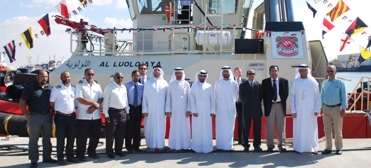 24 November 2015 Sharjah Ports Authority, has taken delivery of a Damen ASD Tug 2411, named Al Luolo’ Aya. His Excellency Sheikh Khaled bin Abdullah bin Sultan Al Qasimi, Chairman of the Department of Seaports and Customs at the Hamriyah Free Zone Authority and Sharjah Airport International Free Zone presided over the ceremony, which was held at Damen Shipyards Sharjah. Also present were Mahamed Meer Abdelrehman Al-Sarrah, Director of Seaports and Customs, Saud Salim Al Mazrouei, Director of Hamriyah Free Zone Authority and Sharjah Airport International Free Zone, Lars Seistrup, Managing Director of Damen Shipyards Sharjah. The ASD 2411 Tug is fully ‘built in Sharjah for Sharjah’. The Sharjah Port and Customs Authority is a long-term customer of Damen and already has eight Damen Stan Tugs and a recently delivered Damen pilot boat in its fleet. The new Damen ASD 2411 is the port’s first ASD tug.