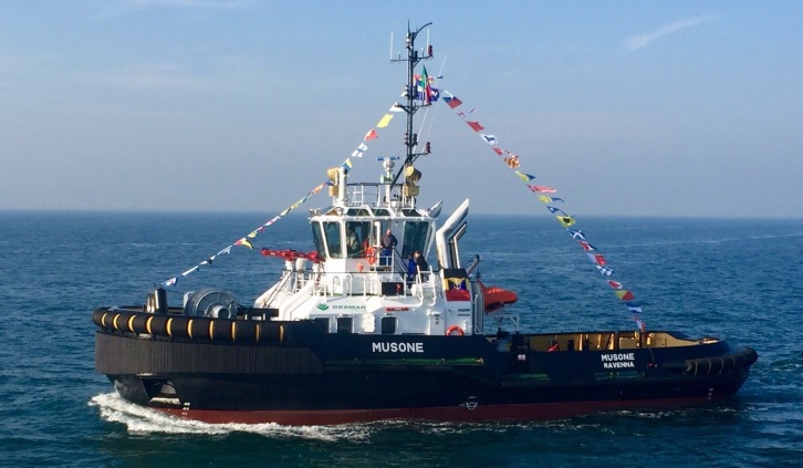 5 February 2016 On 20 January 2016, Corima, part of the Italy-based Gesmar Group, held an official handover ceremony for a Damen ASD 2810 tug. The festivities were attended by invited guests that included representatives from Ancona’s port and city authorities. The family-owned Gesmar Group is the largest towage operator in the Adriatic Sea. The Group’s scope of activities reach to providing harbour assistance duties at eight Italian ports in addition to towing, escorting and offshore towage, safety and FiFi duties at a several offshore oil terminals. Following the on-time and on-budget delivery in November 2015, Corima has mobilised the new 28.67-metre tug, called Musone, in the Port of Ancona, where it provides support services for two oil terminals and one SPM (Safe Point Mooring buoy) for large tankers, operated by API Refinery.