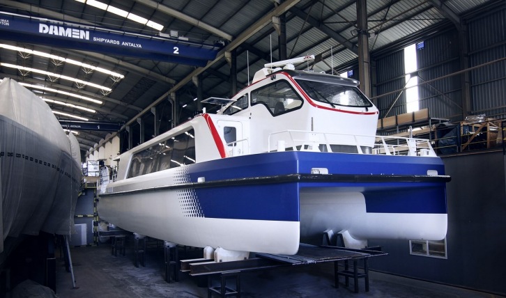 28 September 2016 First composite vessel set to launch Damen is set to launch its first composite Water Bus as the prototype undergoes sea trials in the next few weeks. Customers benefit from reduced fuel consumption, less maintenance, no corrosion or fatigue problems, and at the same time, the Damen Water Bus is very robust. Besides safety and efficiency, the new Water Bus has also been designed to limit noise and vibrations, making it much more comfortable for passengers. Marcel Elenbaas, Damen Design & Proposal Engineer - Fast Ferries, comments: “This is a prototype for the first of the new generation Damen Water Bus. We believe in this new composite vessel and the benefits it offers to clients. The Damen Water Bus is the best fit for highly congested urban areas, providing a simple and efficient way of making use of natural waterways, and consequently integrating into the public transport network. Hence the reason we took the decision to invest in developing this new series.” The Damen Water Bus has a slender hull, less weight than a traditional aluminium vessel and low resistance, producing only a low wake and ensuring the vessel is fuel efficient. It can travel at up to 21 knots or 40 km per hour. The highly manoeuvrable vessel has a capacity up to 100 passengers. The vessel can easily be adapted to specific customer requirements, and the selected composites’ production process facilitates a swift delivery to clients. This next generation Water Bus is also very strong because it is built with high quality vacuum infusion technology, creating a ‘difficult to penetrate closed cell, epoxy sandwich structure’, he stresses. Passenger comfort has also been given priority in the new design. The Damen Water Bus is equipped with two, forward facing, double-screw podded propulsion units, which reduce vibrations, besides offering low fuel consumption. Additionally, the exhaust of these units is under water, further reducing noise and vibrations. The vessel is also designed for easy and efficient boarding and passengers have panoramic views from the large windows on the sides and top deck. Damen Shipyards Group has a long history of producing water taxis, water buses and ferries, mainly built from aluminium and steel, and intended for intensive public transport operations. Damen Shipyards is capable of offering the complete infrastructure system for water buses including jetties and bunkering stations, as well as training and services packages. This Water Bus is the first vessel for public transportation produced at Damen Shipyards Antalya, which specialises in composite professional workboat series suitable for heavy-duty operations. Typically up to 24 metres, these vessels include interceptors, patrol boats, pilot boats, crew suppliers and now water buses. The first Damen Water Bus is expected to be in the Netherlands before the year-end and Damen has another Water Bus hull in stock ready for outfitting.