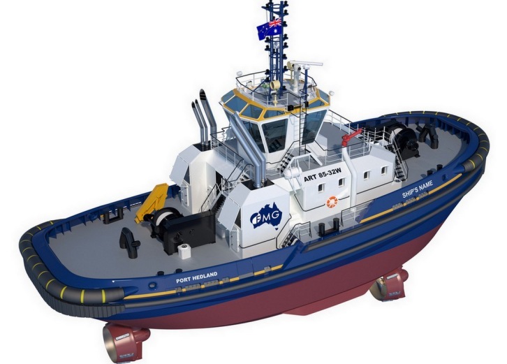 To support Second Towage Licence for the Port of Port Hedland 7 March 2017 Pilbara Marine Pty Ltd (Pilbara Marine), a wholly owned subsidiary of Fortescue Metals Group Ltd has placed an order with Damen Shipyards for the building of six, 32 metre Rotor Tugs. These will be deployed at the company’s operations at Port Hedland on Australia’s west coast, the world’s largest bulk export port. From there, Fortescue exports 165-170 million tonnes of iron ore per year. Their Rotor®Tug propulsion system features three azimuth thrusters; two forward and one aft. The six tugs are of the ART 85-32W class, designed by Robert Allan Ltd. Their Rotor®Tug propulsion system features three azimuth thrusters; two forward and one aft. Together these deliver the full 85 tonnes of bollard pull over both the bow and the stern, and 65% from amidships. The Rotor®Tug system delivers additional benefits regarding manoeuvrability, braking, and engine and winch redundancy. The W notation refers to the increased beam of these designs, providing additional stability during escorting operations conducted regularly at Port Hedland. In May 2016 Pilbara Marine was awarded a second towage license by Pilbara Ports Authority for the port of Port Hedland and the new ART 85-32W rotor tugs will enable it to offer long-term, sustainable towage services. The six Rotor Tugs will be built at Damen’s Song Cam Shipyard in Vietnam. The first two are scheduled for delivery ex-yard by the end of October 2018, with the remaining four due in early 2019. “Damen, as a world leader in the design and construction of tugboats, has been very successful in Australia for many years. This project underlines again that Damen listens carefully to our customers’ needs and that they value our superior quality vessels built for competitive prices, along with our technical expertise and after sales services. These factors have proven the difference in the success of this project,” says Vincent Maes, Area Sales Manager. Rebecca Hayward, Legal Manager Strategic Contracts / Developments at Fortescue Metals Group, added: “After reviewing the market, Damen was an obvious choice because of its global reputation for outstanding quality leading to lower running costs, as well as its proven track record of delivering vessels on time, within budget. We are confident that our full operational requirements will be met by the new ART 85-32W design and are heartened by the fact that Damen will provide long term support here in Western Australia.”