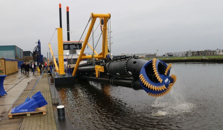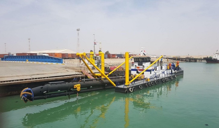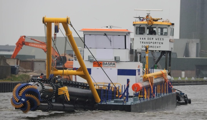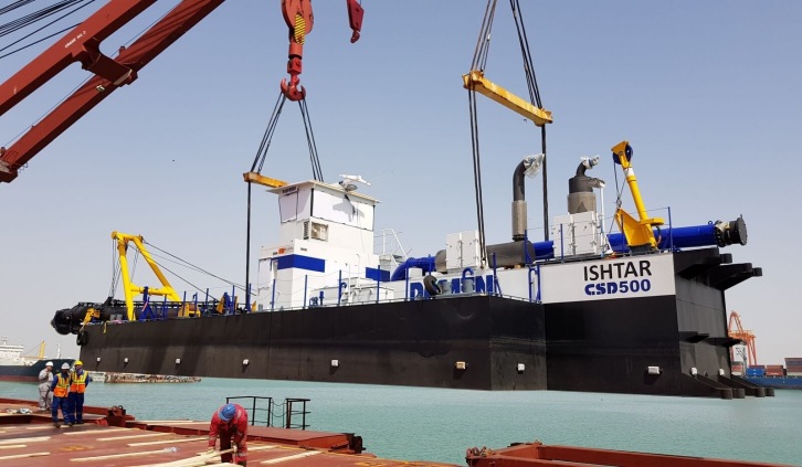 27 March 2018 The Dutch built dredger has arrived on site at Port of Umm Qasr, Iraq Recently, a customised Damen Cutter Suction Dredger, type CSD500, has been named by her owner Basra Gateway terminal at the Damen Dredging yard in the Netherlands. Immediately after the ceremony, the dredger was made ready for transport and towed to Rotterdam, from where it was shipped to Port of Umm Qasr, Iraq. The dredger’s first job will be the port extension for Basra Gataway Terminal. The blessing ceremony took place the 9th of January, when the stationary dredger received the name Ishtar – which translates as ‘Goddess of Love’. The owner, Basra Gataway Terminal (BGT), performed the honours. Mr Phillip Marsham, BGT executive officer, said, “We are proud to take delivery of our new cutter suction dredger. We have bought if from stock for short lead times, and have added a number of options, customising the CSD making it the perfect dredger for the job. Our choice for this Damen CSD is due to the two separate diesel engines on board, being the main engine for the dredge pump power and the auxiliary for the rest of the duties. We see this as an important efficiency gain.” The CSD500 will work on the extension project of the Basra Gateway Terminal, at the Port of Umm Qasr, Iraq. The terminal operator, International Container Terminal Services, Inc. (ICTSI) has started an ambitious port enlargement project. This port expansion has now reached the second phase, starting on deepening of the container terminal using the CSD500 Ishtar. It total some 400 metres of quay wall will be added to the port capacity. Basra Gataway Terminal is supported by Dredge Maritime Consultancy for the on-site project management and project execution. To maximise the production of the dredger, Damen added a spud carriage pontoon and anchor booms. Moreover, a fully equipped accommodation unit was placed under the operating cabin. The cutter ladder was extended for a max dredging depth of -16 metres. To ensure immediate start up on site, the delivery includes a swivel hose as well as 400 metres of floating pipe line. Damen prepared the suction dredger for transport and arranged towage to Rotterdam. The spud carriage pontoon and the eight containers with the pipe line followed separately. The complete delivery from Rotterdam to Port of Umm Qasr is a good example of a complete turnkey package delivery of fully customised dredger with a minimal lead time.