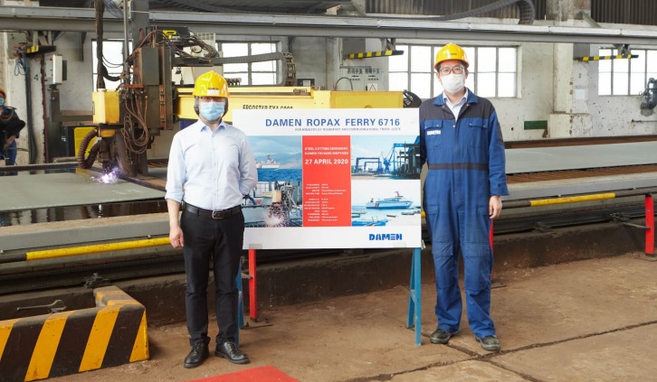 Damen Yichang Shipyard in China hosted a steel cutting ceremony Shipyard uses digital communications to ensure safe steel-cutting ceremony during coronavirus outbreak 8 May 2020 On Monday, 27th April, Damen Yichang Shipyard in China hosted a steel cutting ceremony with a difference. As a result of safety measures surrounding the global COVID-19 outbreak, the occasion of first steel cut for a Damen RoPax Ferry 6716 for the Government of Timor-Leste was marked by a digital gathering. The steel cutting ceremony is always an occasion for celebration and, ordinarily, Damen would invite its clients and guests to attend the event. However, at the current time this is not possible, so the occasion required some digital innovation. Damen sales manager Gysbert Boersma explains, “During the coronavirus crisis, our first priority is for peoples’ safety and well-being. We do, however, still like to mark these important milestones so we do so in a safety-conscious manner, with the aid of digital communications. The steel cutting was a great success; we certainly still managed to make it a special event.” Attendees of the online ceremony included representatives of the Government of Timor-Leste and Damen employees in both China and the Netherlands. The delegates gathered at their individual computers at 14.50 China Standard time (15.50 in Timor-Lest and 08.50 in the Netherlands) to listen to speeches. After this, Damen Yichang Shipyard General Manager Mr Deng Zhiping pushed the button and the first steel was cut. When completed, the 67 x 16 metres vessel will operate a route between Timor-Leste’s capital Dili, the Oecusse enclave and the island of Ataúro. She will carry up to 308 passenger, plus vehicles and goods. The project is co-funded by the governments of Timor-Leste and Germany and is scheduled to begin operations in 2021. The Government of Timor-Leste has stated that the ferry will open up new opportunities for commerce, education and employment in the country. During the coronavirus crisis, Damen Yichang Shipyard has managed to continue production by taking robust safety measures that ensure the well-being of personnel, their families and the wider community. This has included many employees working from home. For those unable to work from home, there has been temperature testing before entry, a rigorous cleaning and disinfection programme and the observation of safe working distance at all times.