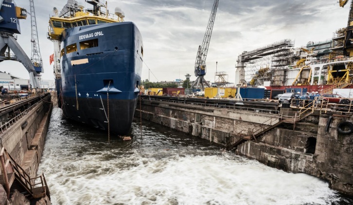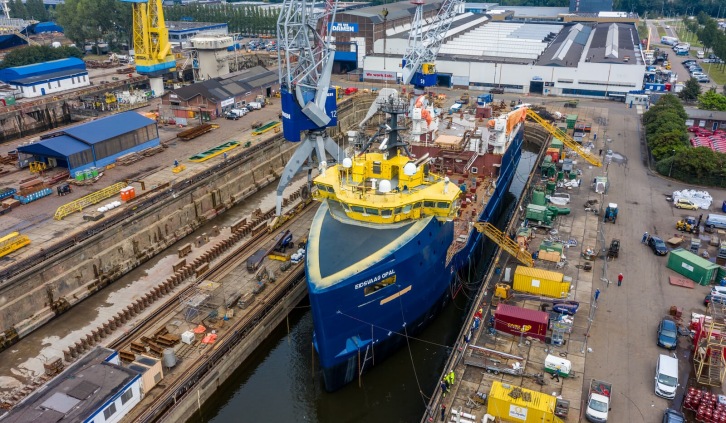Damen Shiprepair Amsterdam completes a conversion project for Eidsvaag Vessel to play significant role in reducing carbon footprint 23 November 2020 Damen Shipyards Group has recently completed a conversion project for Norwegian company Eidsvaag. Following a tender procedure, Damen Shiprepair Amsterdam (DSAm) converted a former platform supply vessel (PSV) into a fish feed carrier, named Eidsvaag Opal, in a project involving a series of major works. Amongst other things, Damen was required to extend the vessel by 5 metres. This involved the yard cutting the hull in two and inserting in new steel sections. Damen was also required to widen the beam of the vessel – using a series of side boxes – to give additional stability and cargo capacity. Additionally the yard integrated 35 new silos and a big bag hold, enabling Eidsvaag Opal to transport up to 2,800 tonnes of fish feed. Damen also outfitted the vessel with five new cranes and a discharge system of conveyors, buckets, elevators and a discharge arm. The project also required considerable electrical work, carried out by FMJ Marine Automation. The supplier removed some 480 cables – approximately 15 kilometres – from the old cargo systems alone. In total, the company pulled 51 kilometres of cable and connected 1,237 cables on the project. DSAm secured the tender to carry out the conversion of Eidsvaag Opal due, amongst other things to its close proximity to Niron Staal – Damen’s specialist steel fabricator. Another factor in the award of tender was Damen’s previous conversion experience for the aquaculture sector and the fact that the company knew the vessel – having built the PSV back in 2013. The project required considerable steel work, totalling 875 tonnes. In addition to the steel work required, the Eidsvaag Opal conversion was given an additional layer of complexity with the arrival of the coronavirus epidemic. This required the yard to cease work on the project for one week, in order to implement robust safety measure. Thanks to this, the project was able to continue with minimum danger to health. Despite the need to socially distance during work on the project, work continued at a good pace – taking in total 346 days. Video by by Damen Shipyards Group.