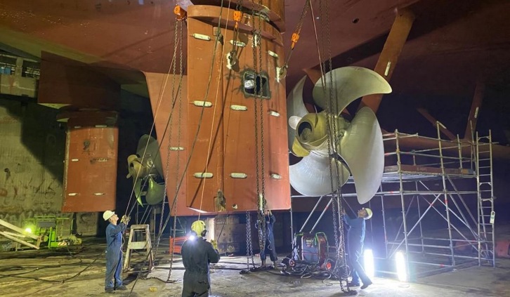 11 January 2021 Late last year, a team of Damen group subsidiaries completed a challenging project to replace one of the twin rudder stocks on P&O Ferries’ Pride of Canterbury. The 180-metre, 30,635 GT RoPax vessel operates on the Dover-Calais crossing, the busiest shipping lane in the world. The nearly 30-year old vessel is equipped with twin Van der Velden® BARKE rudder systems engineered and made by Damen Marine Components (DMC). Replacing the stock on the starboard rudder enables the ferry to extend its already long life in such a demanding role. The project involved three Damen companies working closely together. Damen Verolme Rotterdam (DVR) hosted the vessel while DMC coordinated the project and managed assisting service engineers from DVR and Damen Shiprepair Rotterdam (DSR). The works began with the removal of the rudder and its stock taking placing in DVR’s no. 5 drydock. The rudder together with its worn stock was then transported by road to nearby DSR where it was disassembled and the parts cleaned. Meanwhile, DMC had designed and supplied the new rudder stock and delivered it also to DSR, ahead of installation. The most technically exacting part of the project was the fitting of the new stock to the rudder. This had to be done to the finest tolerances using techniques including bluefit to ensure optimal performance, and it had its risks. Any errors in the machining that affected the positioning and finish, and the stock would have to be discarded and refabricated, with a high cost in time and money. The fitting took place at DSR and to ensure that the process went perfectly, experienced service engineers from the sister companies teamed up under the guidance of DMC and used the old rudder stock for a trial fit. This determined the exact values that the replacement stock would need to meet in order to fit the rudder blade perfectly. Tests took place during the machining in order to ensure that the process continued on track. With the new rudder stock fitted to the correct values, the blade was hung vertically and the new stock inserted to confirm that it fitted. The two parts were then transported to DVR and mounted in the vessel where the gap between the rudder stock and blade was measured and determined to be exactly as specified. Finally, the rudder and steering gear were then prepared for operations and a swing-test was performed to confirm that everything worked perfectly. "We completed the entire project on time and without any delays by bringing together skills and resources from across the Damen Group," says Walter Treffers, area manager service sales at DMC. "For the ship owner it was crucial to have the ship out of the dock on schedule, and this was achieved thanks to the excellent cooperation and daily meetings between the yard, DMC, DVR and DSR. We wish the Pride of Canterbury safe journeys." DMC performs repair job on 180m RoPax vessel Pride of Canterbury from P&O Ferries. Video by by Damen Shipyards Group.