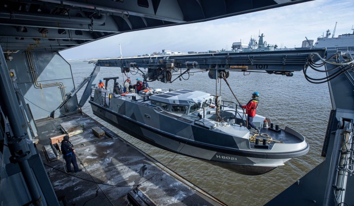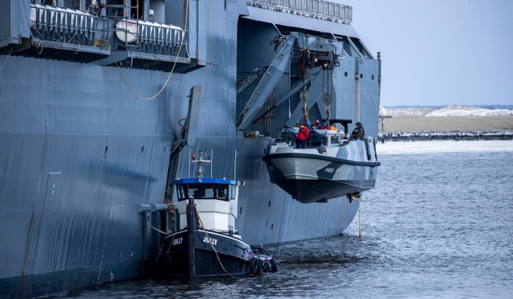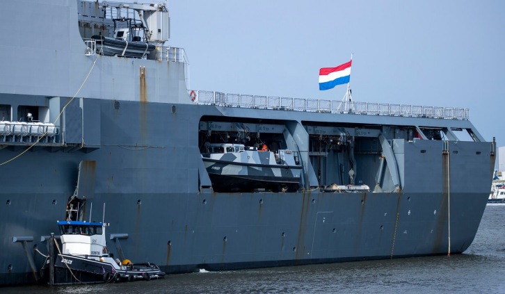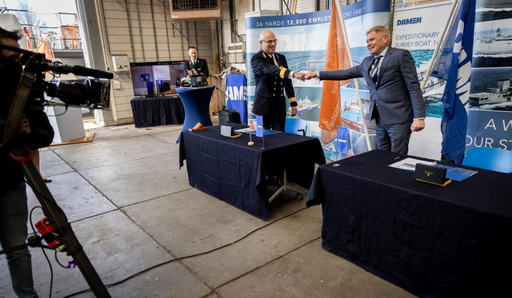 3 March 2021 On Friday, February 26, 2021, the naming ceremony and transfer of the Expeditionary Survey Boat (ESB) Hydrograaf of the Royal Netherlands Navy took place at Damen Shipyards Den Helder (DSDH). Due to the coronavirus measures currently in force, the naming ceremony and handover took place in an adjusted manner, whereby the majority of the invitees were present via a livestream. The naming was also carried out remotely, whereby outgoing State Secretary of Defence Barbara Visser shattered the bottle of champagne against the ship in Den Helder with the press of a button. The ceremony was attended physically and at an appropriate distance by deputy commander of the naval forces rear admiral Nacht Hulsker, captain of the ESB lieutenant at sea 2 (OC) van Amerongen, director of projects DMO commander Kreiter, deputy director of DSDH Peter van den Berg and the responsible project leader of DSDH. The design and construction of the Hydrograaf was realised in close collaboration between the DMO and DSDH. Peter van den Berg of DSDH: “Our project manager, together with the Ministry of Defence team, delivered a high-tech performance in the design and construction of this new type of ship.” After construction, the Hydrograaf was allowed to receive a maximum weight of 24 tons, in connection with the maximum permissible loading weight of the Davits hoisting installation on ships such as HNLMS Johan de Witt. At the same time, the ship must reach a speed of at least 20 knots, with very low noise requirements and limited space for recording all hydrographic equipment. After the naming ceremony, the ESB was symbolically handed over by DSDH to Defensie Materieel Organistatie’s (DMO) Director of Projects, commander Kreiter, followed by a toast to the vessel and her crew. In the coming weeks, the ESB will be prepared for handover to the RNLN, which will start operating the vessel after a work-up period of several weeks. The ESB will provide up-to-date information about the soil conditions and the situation below the waterline in places where that insight is required. With this information, the Royal Netherlands Navy (RNLSN) supports expeditionary maritime operations and provides an environment in which ships can navigate safely. The main tasks of the ESB are: • Gathering environmental information to make decisions about the (im)possibilities of an amphibious operation; • Performing hydrographic survey operations in support of emergency relief operations; • Supporting with civil hydrographic tasks on the national continental shelf (NCP). The sixteen metre long ESB can be deployed from the so-called big decks, such as Zr. Ms. Johan de Witt. The ESB can independently perform hydrographic surveys under tactical conditions at a greater distance from the mother ship. She is a fully fledged platform that is comparable to a hydrographic survey vessel (HOV) and meets the highest survey standards. The name Hydrograaf has been chosen in honour of the National Inspection Vessel Hydrograaf from 1910. It is also a clear reference to the primary task. Video by by Damen Shipyards Group.