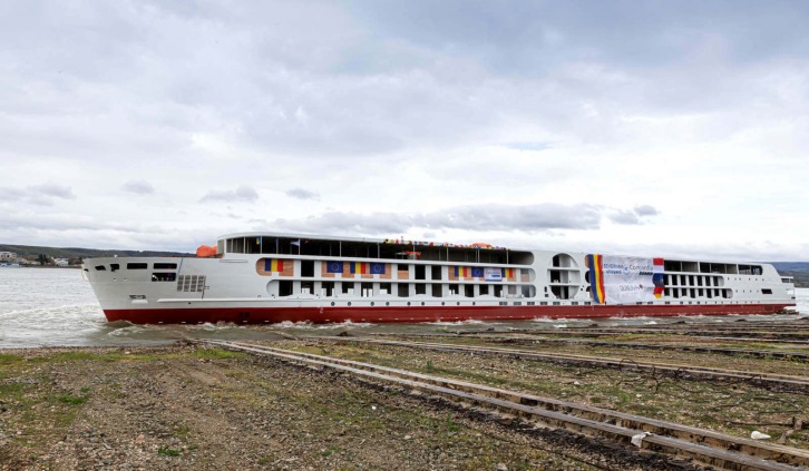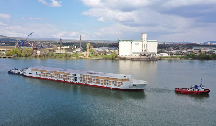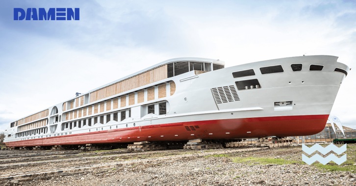 29 April 2021 Concordia Damen has completed the build of the hull of the latest addition to the fleet of A-ROSA Flussschiff, one of Europe's leading operators of river cruises. In the next stage of the vessel's construction, the hull will be transported by the heavy-lift vessel Yacht Express to Damen Shipyards Gorinchem in the Netherlands, where Concordia Damen will perform the outfitting. Measuring 135 metres in length and 17.7 metres across, the four-deck vessel will feature 140 cabins ranging from two person to family units, making her the largest vessel to be operating on the Rhine in terms of passenger numbers. The majority of the cabins will have their own balconies and accommodation with separate living and sleeping areas available. Other family-friendly features include a children's play lounge and pool as well as a larger pool for all ages on the sun deck. The restaurant will also have a separate children's eating area. The adults meanwhile will be able to enjoy an unprecedented range of amenities including a sauna, whirlpool, ice grotto, heat bench and treatment rooms when they are not enjoying the sights from their balconies or the sun deck as they cruise along the river, or are ashore discovering the history and culture of the northern Rhine. Nor have the staff and crew been forgotten. They will have their own generously spaced cabins along with, for the first time, their own rest and relaxation area where they can unwind before and after working hours. In line with the principles of both A-ROSA's and Concordia Damen's, the river cruise ship will have a special focus minimising impact on its surrounding environment. A-ROSA describes its newbuild as an ‘E-Motion' vessel, and it will be equipped with a hybrid propulsion system including a zero-emissions battery drive. A diesel engine will be used for cruising, but when entering and leaving port the ship will switch to an electric engine powered by the battery for emissions-free operations. She will also be fitted for shore power, making her as clean at rest as she is underway. In addition, the hull has been optimised for minimum resistance and all heat and excess energy will be recovered where possible. "We are delighted to be the starting the next stage of this exciting new vessel," says Project Manager Johan Muilenburg. "As a traditional yet innovative shipbuilder we are confident that she will both set a new standard in socially responsible river cruising and exceed the expectations of her guests when it comes to comfort and amenities." Delivery is scheduled for the spring of 2022 in time for the year's summer season.