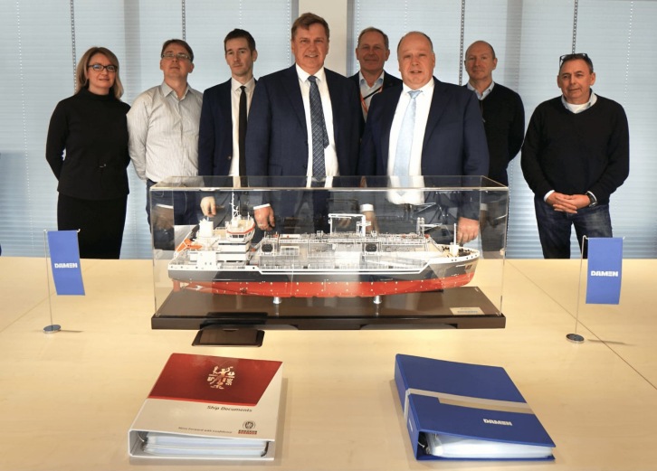 On the photo from left to right: Jelena Fedosejeva (Member of the Supervisory Board), Virgo Vinkel (Shipbuilding Advisor), Sergei Danilov (Project Manager LNG), Ain Hanschmidt (Member of the Management Board), Indra Kaunis (Legal Counsel), Peter Anssems (Sales Manager, Damen), Tarvi-Carlos Tuulik (CEO Ship management / Chief Captain), Jan Versteijlen (Project Manager, Damen). Image by Damen Shipyards Group Ain Hanschmidt, CEO of Estonia-based investment company Infortar says: "The launching of this LNG bunkering vessel is consistent with our long-term strategy to invest in safe and sustainable LNG supply for various maritime customers in the Gulf of Finland region." "We are very pleased to be playing a significant role in making sustainable shipping more accessible to ship-owners and operators in the Gulf of Finland," added Peter Anssems, Damen Sales Manager for East Europe. "We are confident that Optimus will give many years of productive service to Elenger and its customers." The construction of Optimus has been supported by the EU CEF (Connecting Europe Facility) funding programme and was co-financed by the leading financial services group in Finland, OP Financial Group. Damen Shipyards Group press release