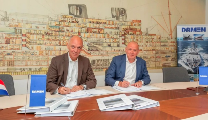 RH Marine Managing Director Hugo Loudon (left) and Damen Naval Managing Director Roland Briene sign the agreement. Image by Damen Shipyards Group. Damen Shipyards Group press release