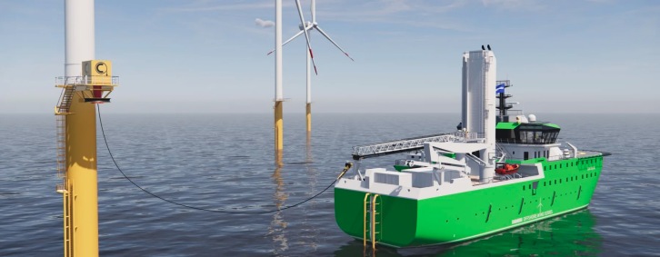 28 Nov 2023 Damen Shipyards Group has officially launched its latest vessel, a fully electric Service Operations Vessel (SOV), 70 metres x 17 metres. With its offshore charging capabilities, the vessel paves the way for significantly reduced emissions in the maintenance of offshore wind farms. Creating a total solution Three years ago, Damen set out to assess the feasibility of an electric SOV to dramatically increase sustainability of vessel operations at offshore wind farms. The shipbuilder quickly established that technically it would be possible. However, two main questions were to be answered. Firstly, for this to be possible, offshore charging capabilities would be required. Secondly, given that this model represents an increase in CAPEX costs, it had to be established if there was a healthy business case. To achieve offshore charging, Damen has partnered with UK-based MJR Power & Automation – a company that has previously developed an offshore charging system for a crew transfer vessel. MJR took up the challenge, developing a system that was fast, efficient and, above all, safe. Safe, efficient and cost-conscious charging The charging system uses the motion-compensated gangway to create a connection between the vessel and a turbine or substation offshore, in much the same way a personnel transfer is undertaken. Damen and MJR selected the charging method in order to maximise safety and efficiency. The gangway is controlled from the wheelhouse, requiring no manual interaction with charging equipment. It has the added benefit of utilising pre-existing offshore infrastructure, thereby adding considerable cost-efficiency. Charging is carried out while the vessel is in a low power, so-called "green" DP mode, requiring less energy than the hotel load. A full charge typically requires energy produced in just a few hours by a single turbine. The system is designed according to international recognised safety standards, including IEC/IEEE 80005-1. Additionally, it is about to obtain DNV AIP (Approval In Principle) and is designed in accordance with forthcoming offshore charging standards under collaborative development by DNV UK and Norway. MJR has developed a 4MW charger connector, sufficient for a 70-metre vessel. The company is also working on a scaled up 8MW, version that will enable charging of larger vessels, up to 90 metres.