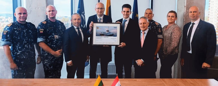 On the top image from left to right: Gintas Gumbrys (CDR), Justinas Žukauskas (LCDR), Vadim Akimov (Damen Shipyards Sales Director), Sigitas Dzekunskas (DMA Director), Justin Rietveld (Damen Shipyards Sales Manager), Jack Twiss Quaries van Ufford (Ambassador of the Kingdom of the Netherlands to Lithuania), Tadas Jablonskis (CAPT(N)), Jolanta Viduto (DMA), Gytis Augunas (Damen Representative). Image by Damen Shipyards Group. Damen Shipyards Group press release