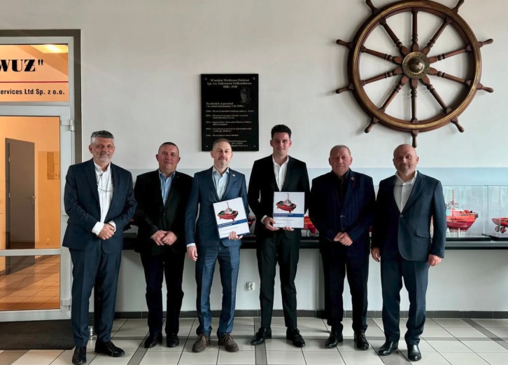 From left to right: Ryszard Kozakiewicz (Damen Representative), Jarosław Mikielewicz (WUZ Member of the Board), Dariusz Bączkowski (WUZ Member of the Board), Justin Rietveld (Damen Sales Manager), Marek Wengrzyn (WUZ Chairman), Vadim Akimov (Damen Sales Director). Image by Damen Shipyards Group. Damen Shipyards Group press release