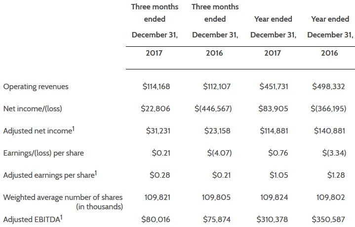 Danaos' CEO Dr. John Coustas commented: Our earnings for the fourth quarter of 2017 improved markedly when compared to the earnings of the fourth quarter of 2016 which had been negatively impacted in the aftermath of the Hanjin bankruptcy. This is mainly the result of our high charter contract coverage which remains at 86% for the next 12 months based on current operating revenues and 69% in terms of contracted operating days. Adjusted net income of $31.2 million for the quarter represented an increase of $8.0 million, or 34.5%, compared to $23.2 million for the fourth quarter of 2016. This increase was attributable to a $5.2 million increase in the operating revenues of the vessels that were previously chartered to Hanjin compared to the fourth quarter of 2016, and improved operating performance of $2.8 million. As previously reported, the Company is in breach of certain financial covenants as a result of the Hanjin bankruptcy. We are currently engaged in discussions with our lenders regarding restructuring our debt, substantially all of which matures on December 31, 2018. In the meantime, we continue to generate positive cash flows from our operations and currently have sufficient liquidity to service all our operational obligations as well as all scheduled principal amortization and interest payments under the original terms of our debt agreements leading up to the December 2018 maturity date. The charter market in general has stabilized at slightly better levels compared to the lows of 2016. However, although the size segment above 10,000 TEU has recently seen some improvement, the size segment between 5,000 to 10,000 TEU has retracted from the charter rate levels achieved within 2017. For panamax vessels between 4,000 to 5,000 TEU the market is stagnant however comfortably above operating costs. For the smaller feeder sector there is a firming market however the lack of long term fixtures shows that there is no faith in the sustainability. We do not expect a material improvement in the market environment within 2018, given the large number of scheduled vessel deliveries. Danaos continues to have low near term exposure to the weak spot market as a result of the aforementioned charter coverage. During this extended period of market weakness which has presented many challenges, we remain focused on taking necessary actions to preserve the value of our company. Three months ended December 31, 2017 compared to the three months ended December 31, 2016 During the three months ended December 31, 2017 and December 31, 2016, Danaos had an average of 55 containerships. Our fleet utilization for the fourth quarter of 2017 was 97.8%, while fleet utilization for the vessels under employment, excluding the off charter days of the vessels that were previously chartered to Hanjin Shipping ("Hanjin"), was 97.8% in the three months ended December 31, 2017 compared to 99.5% in the three months ended December 31, 2016. Our adjusted net income amounted to $31.2 million, or $0.28 per share, for the three months ended December 31, 2017 compared to $23.2 million, or $0.21 per share, for the three months ended December 31, 2016. We have adjusted our net income in the three months ended December 31, 2017 for refinancing related professional fees of $5.0 million and a non-cash amortization charge of $3.4 million for fees related to our 2011 comprehensive financing plan (comprised of non-cash, amortizing and accrued finance fees). Please refer to the Adjusted Net Income reconciliation table, which appears later in this earnings release. The increase of $8.0 million in adjusted net income for the three months ended December 31, 2017 compared to the three months ended December 31, 2016 is attributable to a $2.1 million increase in operating revenues, a $5.1 million decrease in total operating expenses, a $1.0 million decrease in realized loss on derivatives, a $0.5 million increase in other income and a $0.3 million improvement in the operating performance of our equity investment in Gemini Shipholdings Corporation ("Gemini"), which were partially offset by a $1.0 million increase in net finance expenses. On a non-adjusted basis, our net income amounted to $22.8 million, or $0.21 per share, for the three months ended December 31, 2017 compared to a loss of $446.6 million, or $4.07 loss per share, for the three months ended December 31, 2016, which includes $466.9 million of impairment related expenses. Operating Revenues Operating revenues increased by 1.9%, or $2.1 million, to $114.2 million in the three months ended December 31, 2017 from $112.1 million in the three months ended December 31, 2016. Operating revenues for the three months ended December 31, 2017 reflect: • $5.2 million increase in revenues in the three months ended December 31, 2017 compared to the three months ended December 31, 2016 due to the recorded charter income of $6.7 million from eight of our vessels previously chartered to Hanjin Shipping ("Hanjin") that had recorded operating revenues of $1.5 million during the fourth quarter of 2016. • $2.7 million decrease in revenues in the three months ended December 31, 2017 compared to the three months ended December 31, 2016 due to the re-chartering of certain of our vessels at lower rates. • $0.4 million decrease in revenues attributed to fleet utilization in the three months ended December 31, 2017 compared to the three months ended December 31, 2016. Vessel Operating Expenses Vessel operating expenses increased by 1.2%, or $0.3 million, to $26.2 million in the three months ended December 31, 2017 from $25.9 million in the three months ended December 31, 2016. The average daily operating cost per vessel for vessels on time charter was $5,583 per day for the three months ended December 31, 2017 compared to $5,303 per day for the three months ended December 31, 2016. Management believes that our daily operating cost ranks as one of the most competitive in the industry. Depreciation & Amor