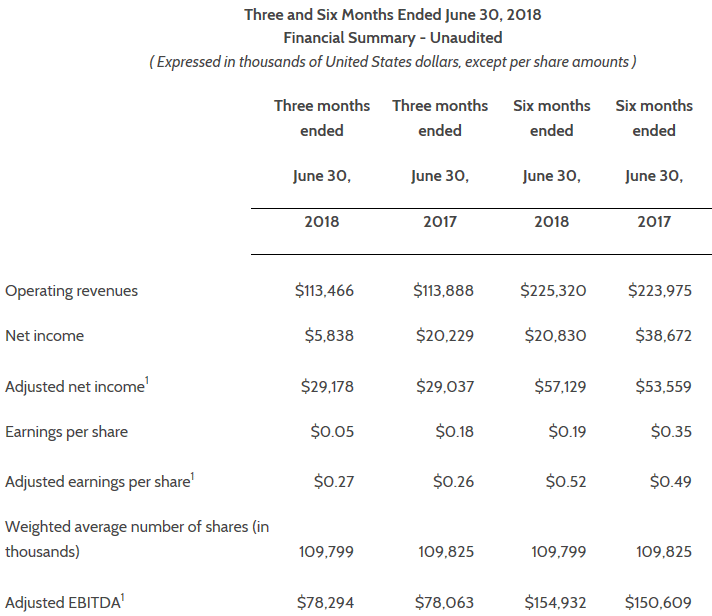 (1) Adjusted net income, adjusted earnings per share and adjusted EBITDA are non-GAAP measures. Refer to the reconciliation of net income to adjusted net income and net income to adjusted EBITDA. Danaos' CEO Dr. John Coustas commented: "Following the successful completion of our debt re-financing, the Company's capital structure has been strengthened by a significant debt reduction of approximately $551 million, while financial covenants have been amended and the maturities have been extended by more than 5 years until the end of 2023. We are currently fully compliant with all terms of our debt agreements and the Company is now free to resume its pursuit of growth opportunities with the goal of creating value for its shareholders. The Company continued to achieve strong financial results in the second quarter of 2018. Adjusted net income of $29.2 million for the quarter was slightly higher when compared to $29 million for the second quarter of 2017. The charter market, showed signs of improvement in the second quarter, but has softened by about 10 - 15% on average across all segments since June. Larger vessels have recorded slightly higher percentage reductions as they had outpaced the market average. The market is very skeptical of trade developments and the recently announced new tariffs on Chinese imports. At the same time uncertainty discourages new ordering, which is positive for the medium to long-term health of the charter market as liner companies are refraining from making substantial commitments until the outlook becomes clearer. There is interest on the new regulations and the question of scrubbers and we expect this to play out over the next few months. We are of course largely insulated from the softening charter market since we maintain high charter contract coverage of 87% for the next 12 months based on current operating revenues and 77% in terms of contracted operating days. Danaos continues to be a leader in the container shipping industry as a result of our intense focus on continuously enhancing our operations and leveraging technical innovation to provide the highest quality service to our customers. Our industry has undergone significant changes during the past few years, and with the improved capital structure contemplated by our comprehensive re-financing agreement, we are well positioned to take advantage of the growth opportunities in the container sector and create value for our shareholders." Three months ended June 30, 2018 compared to the three months ended June 30, 2017 During the three months ended June 30, 2018 and June 30, 2017, Danaos had an average of 55 containerships. Our fleet utilization for the three months ended June 30, 2018 was 96.1% compared to 97.9% for the three months ended June 30, 2017. The fleet utilization excluding the off charter days of the vessels that were previously chartered to Hanjin Shipping ("Hanjin") was 98.8% in the three months ended June 30, 2017. Our adjusted net income amounted to $29.2 million, or $0.27 per share, for the three months ended June 30, 2018 compared to $29.0 million, or $0.26 per share, for the three months ended June 30, 2017. We have adjusted our net income in the three months ended June 30, 2018 for refinancing related professional fees of $20.1 million and a non-cash amortization charge of $3.2 million for fees related to our 2011 comprehensive financing plan (comprised of non-cash, amortizing and accrued finance fees). Please refer to the Adjusted Net Income reconciliation table, which appears later in this earnings release. The increase of $0.2 million in adjusted net income for the three months ended June 30, 2018 compared to the three months ended June 30, 2017 is attributable to a $1.8 million decrease in total operating expenses, a $0.5 million increase in other income and a $0.1 million operating performance improvement on equity investments, which were partially offset by a $0.4 million decrease in operating revenues and a $1.8 million increase in net finance expenses. On a non-adjusted basis, our net income amounted to $5.8 million, or $0.05 per share, for the three months ended June 30, 2018 compared to net income of $20.2 million, or $0.18 per share, for the three months ended June 30, 2017. Full report Danaos Corporation press release |