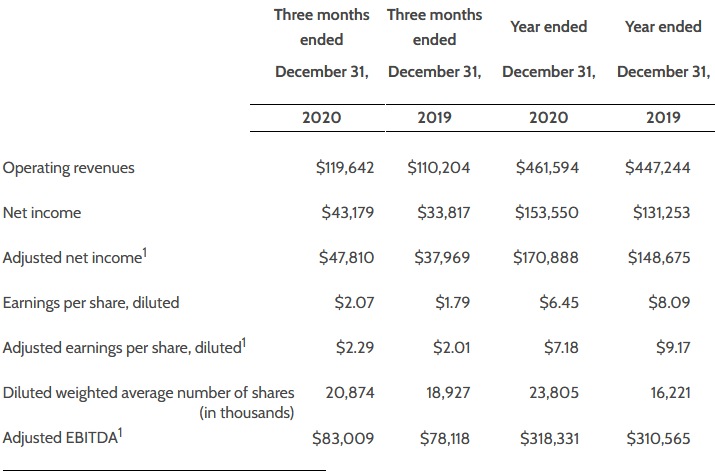 1. Adjusted net income, adjusted earnings per share and adjusted EBITDA are non-GAAP measures. Please refer to the reconciliation of net income to adjusted net income and net income to adjusted EBITDA. 2. Contracted revenue as of December 31, 2020 on the basis of concluded charter contracts through February 15, 2021. Danaos’ CEO Dr. John Coustas commented: "In the fourth quarter of 2020, we witnessed the most outstanding turnaround in the container industry for as long as I can remember. Market participants were caught by surprise as the chronic underinvestment in capacity coupled with a sudden resurgence of demand created a spike that drove container box rates to all-time highs. This led to a massive increase in our customers’ profitability and significantly diminished the counterparty risk that was so prevalent at the end of the first quarter of 2020. The charter market, in turn, rapidly strengthened, resulting in decade-high charter rates across almost all vessel types. Now everyone is focused on whether the current market strength is sustainable and for how long. Fortunately, incremental vessel supply will remain low for the time being. Although there have been new orders placed, the current orderbook is at historically low levels. Since there is a two-year lead time for new orders to hit the water, supply growth should be moderate for the next couple of years. What will happen next depends a lot on the environmental initiatives, regulations and of course demand. As far as Danaos is concerned we experienced a strong quarter, completed delivery of all contracted vessels, realized significant gains, displayed exceptional rechartering performance and entered into agreements for a very important refinancing. This quarter we saw an improvement in Adjusted EBITDA and Adjusted Net Income compared to the same quarter in the prior year. This improvement should be even more pronounced in the coming quarters as new contracted charters at significantly higher rates start to contribute to our top line. We have concluded 27 recharterings over the past three months for periods of 12-24 months at rates between two and three times the rates of the expiring charters. In doing so, we have practically covered 91% of our 2021 operating days and a significant portion of our 2022 operating days. We currently expect revenue in 2021 to exceed 2020 revenue by at least $100 million. The recent performance of both ZIM and HMM has resulted in a $23.8 million increase in the recorded value of our bond holdings in these two companies, which increased in value to approximately $63 million as of the end of 2020. The ZIM IPO has also provided a marked-to-market value for our 10.2mn shares in ZIM, which have a value exceeding $200 million based on Zim’s closing share price of $20.12 per share on February 12, 2021. These shares were valued at $75,000 as of the end of 2020. We have also recently concluded a $300 million bond offering, which was over three times oversubscribed, an extraordinary accomplishment for a first-time issuer. These funds, together with another $950 million of bank and lease financing, will be used to refinance most of our existing credit facilities and form the basis of our new strategy as we will not have any maturities until 2025. We are happy that the market has acknowledged our accomplishments, leading to a dramatic outperformance of our share price as compared to our peers. We are well-positioned and committed to continue to take actions to create value for our shareholders." Three months ended December 31, 2020 compared to the three months ended December 31, 2019 During the three months ended December 31, 2020, Danaos had an average of 58.5 containerships compared to 55.0 containerships during the three months ended December 31, 2019. Our fleet utilization for the three months ended December 31, 2020 was 97.9% compared to 97.0% for the three months ended December 31, 2019. Our adjusted net income amounted to $47.8 million, or $2.29 per share, for the three months ended December 31, 2020 compared to $38.0 million, or $2.01 per share, for the three months ended December 31, 2019. We have adjusted our net income in the three months ended December 31, 2020 for amortization of non-cash fees and accrued finance fees charges of $4.6 million. Please refer to the Adjusted Net Income reconciliation table, which appears later in this earnings release. The increase of $9.8 million in adjusted net income for the three months ended December 31, 2020 compared to the three months ended December 31, 2019 is attributable mainly to a $9.4 million increase in operating revenues, a $6.0 million decrease in net finance expenses and a $0.5 million increase in the operating performance of our equity investment in Gemini Shipholdings Corporation (“Gemini”), which were partially offset by a $6.1 million increase in total operating expenses. On a non-adjusted basis, our net income amounted to $43.2 million, or $2.07 earnings per diluted share, for the three months ended December 31, 2020 compared to net income of $33.8 million, or $1.79 earnings per diluted share, for the three months ended December 31, 2019. Full report About Danaos Corporation Danaos Corporation is one of the largest independent owners of modern, large-size containerships. Our current fleet of 65 containerships aggregating 403,793 TEUs, including five vessels owned by Gemini Shipholdings Corporation, a joint venture, ranks Danaos among the largest containership charter owners in the world based on total TEU capacity. Our fleet is chartered to many of the world's largest liner companies on fixed-rate charters. Our long track record of success is predicated on our efficient and rigorous operational standards and environmental controls. Danaos Corporation's shares trade on the New York Stock Exchange under the symbol "DAC". Danaos Corporation press release