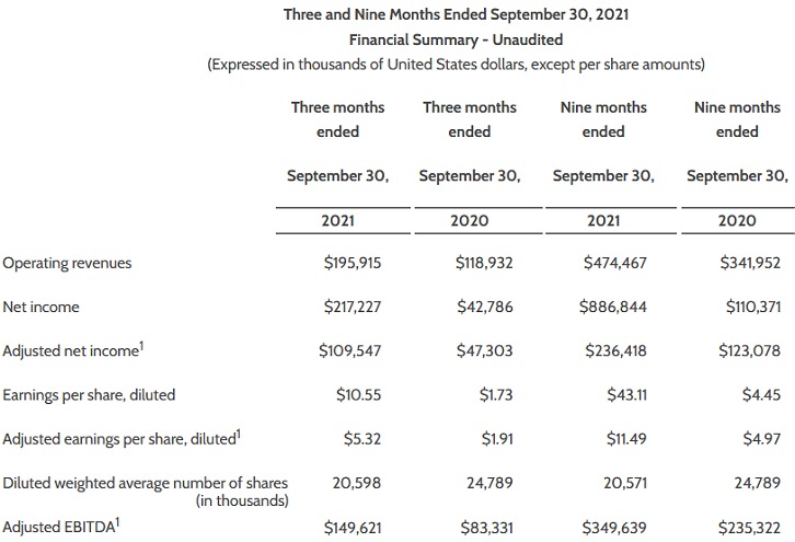 (1) Adjusted net income, adjusted earnings per share and adjusted EBITDA are non-GAAP measures. Refer to the reconciliation of net income to adjusted net income and net income to adjusted EBITDA. Danaos' CEO Dr. John Coustas commented: "We are certain that everyone is aware of the well-documented disruptions to the global supply chain that continue unabated. This situation, despite its negative effect in world growth, had extremely positive effects in our market which continues from strength to strength. Despite efforts by all participants to alleviate the disruptions to the global supply chain, there are no signs that conditions are improving. The main contributing factors are an increase in demand, lack of available vessels to satisfy such demand and low levels of productivity in the ports and other land-based infrastructure. Additionally, as new vessel deliveries in 2022 are actually expected to be lower than in 2021, we do not expect any respite at least from the vessel supply front in the near term. In 2023, increased deliveries are forecasted, although there will be an offsetting effect from new environmental regulations that will likely tighten the effective supply of vessels due to the anticipated reductions in speed. Overall, we do not expect a dramatic difference, provided demand remains healthy. During the third quarter, we consummated the acquisition of Gemini and acquired six modern 5,500 TEU vessels, all with existing cash resources. On the back of these moves we have achieved record EBITDA and Net Income. We have also expanded our charter coverage and now have in excess of $2 billion of charter backlog. Our share ownership in ZIM - although adjusted as per our usual practice - will also contribute around half a billion dollars to our earnings for 2021 which is outstanding. Our liquidity in terms of cash and marketable securities is still close to half a billion and we are closely monitoring our options and strategy for next year to deliver even better results for the Company and our shareholders. In the meantime, liner companies are announcing record results which is extremely positive for Danaos as the strong credit quality of our customers continues to improve. The continued strong performance of Danaos is ensured by existing charters with an average charter duration of 3.3 years and new charters that lock in current rates for several years. We expect strong market conditions to persist in the near term, which will support a strong re-chartering environment into next year and should ensure our stellar performance for the next 3 years." Three months ended September 30, 2021 compared to the three months ended September 30, 2020 During the three months ended September 30, 2021, Danaos had an average of 65.7 containerships compared to 58.0 containerships during the three months ended September 30, 2020. Our fleet utilization for the three months ended September 30, 2021 was 97.7% compared to 98.7% for the three months ended September 30, 2020. Our adjusted net income amounted to $109.5 million, or $5.32 per share, for the three months ended September 30, 2021 compared to $47.3 million, or $1.91 per share, for the three months ended September 30, 2020. We have adjusted our net income in the three months ended September 30, 2021 for a $64.1 million gain on our acquisition of the remaining interest in Gemini Shipholdings Corporation (“Gemini”), the change in fair value of our investment in ZIM Integrated Shipping Services Ltd. (“ZIM”) of $47.2 million and a non-cash fees amortization and accrued finance fees charge of $3.6 million. Please refer to the Adjusted Net Income reconciliation table, which appears later in this earnings release. The increase of $62.2 million in adjusted net income for the three months ended September 30, 2021 compared to the three months ended September 30, 2020 is attributable mainly to a $77.0 million increase in operating revenues and collection of a $12.3 million dividend from ZIM, which were partially offset by a $17.3 million increase in total operating expenses, a $8.3 million increase in net finance expenses, and a $1.5 million decrease in our equity investment in Gemini following our acquisition and full consolidation by us since July 1, 2021. On a non-adjusted basis, our net income amounted to $217.2 million, or $10.55 earnings per diluted share, for the three months ended September 30, 2021 compared to net income of $42.8 million, or $1.73 earnings per diluted share, for the three months ended September 30, 2020. Our net income for the three months ended September 30, 2021 includes a $64.1 million non-cash gain on our acquisition of Gemini and a total gain on our investment in ZIM of $59.5 million. Operating Revenues Operating revenues increased by 64.8%, or $77.0 million, to $195.9 million in the three months ended September 30, 2021 from $118.9 million in the three months ended September 30, 2020. Operating revenues for the three months ended September 30, 2021 reflect: • a $30.6 million increase in revenues in the three months ended September 30, 2021 compared to the three months ended September 30, 2020 mainly as a result of higher charter rates; • a $15.6 million increase in revenues in the three months ended September 30, 2021 compared to the three months ended September 30, 2020 due to the incremental revenue generated by newly acquired vessels; • a $21.5 million increase in revenue in the three months ended September 30, 2021 compared to the three months ended September 30, 2020 due to higher non-cash revenue recognition in accordance with US GAAP; and • a $9.3 million increase in revenues in the three months ended September 30, 2021 compared to the three months ended September 30, 2020 due to amortization of assumed time charters. Vessel Operating Expenses Vessel operating expenses increased by $7.0 million to $34.7 million in the three months ended September 30, 2021 from $27.7 million in the three months ended Sept