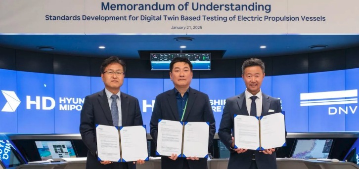 Seoul, South Korea - January 23, 2025 DNV has signed a Memorandum of Understanding (MoU) with HD Hyundai Mipo (HMD) and HD Korea Shipbuilding & Offshore Engineering (KSOE). The collaboration focuses on developing standards for testing electric powered vessels through the use of digital twin-based criteria and procedures, to enhancing ship safety and efficiency. This collaborative project aims to resolve issues related to the integration of highly complex vessel systems for electric propulsion. Utilizing hardware in the loop (HiL) testing via digital twins of the different systems enables integration tests to be performed both earlier in the process on a much broader and deeper level. To ensure the accuracy of the tests, however, we need to be confident in the digital assets. Together DNV, HMD and KSOE are working on the verification of these digital assets. Utilizing DNV verified digital assets, will facilitate the integration process. In addition, when systems from multiple suppliers are tested together, having the same requirements and HiL test procedures ensures the reliability of the testing. Kitae Kim, Head of Quality Management, HD Hyundai Mipo, said: "Through this technical collaboration we aim to establish clear and practical digital twin-based testing procedures and standards. These can foster broader industry participation and ensure the reliability of results. In doing so, we hope to safeguard the performance and safety of ship systems and lead in building a digital twin ecosystem for the shipbuilding industry." Byoung Hun Kwon, Head of the Electrification Center/Digital Technology Research Lab, at HD KSOE, said: "We have proactively developed and implemented digital twin technology, including HiL, to safeguard the performance and quality of vessels, achieving world-class advancements in virtual commissioning technology. This collaboration marks a pivotal milestone, uniting HD Hyundai Mipo, HD KSOE, and DNV to drive digital innovation in the shipbuilding and marine industry."