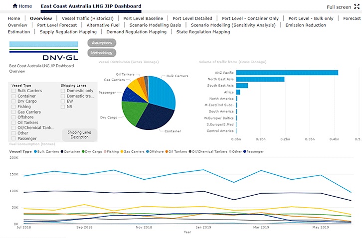 Image by DNV GL The results are presented in a unique dashboard. It incorporates vessel arrival information and fuel consumption data for 2018–2019 as the baseline and enables detailed analysis and forecasting based on ship type, size, age, port of origin, alternative fuel uptake and fleet development through to 2050. With LNG gaining momentum as an optimal fuel for low emissions shipping, the dashboard shows that there is a huge growth potential for Australia with the presence of abundant production facilities. Ports identified as important facilities for LNG supply, namely Newcastle, Port Kembla and Hastings, should develop scalable infrastructures to support the growing demand for different ship types. "DNV GL is proud to have facilitated this project, which is modelled after the forecast methodology of our annual energy transition publication, the Maritime Forecast to 2050. With an interactive dashboard hosted on our open industry platform Veracity, it consolidates data from multiple sources onto a single interface and allows for constant iterations to reflect an up-to-date scenario model to support decisions on adopting LNG as a fuel," added Jonathan Abrahams.