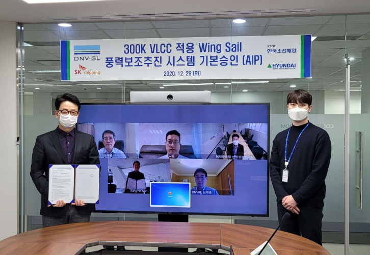 The virtual award ceremony recently took place in the presence of Hyunjoon Shin, Head of the Future Ship Research Department of KSOE, Haeyong Son, Vice President of SK Shipping, and Sung Ho Shin, Key Account Manager of DNV GL Korea. The wind-powered auxiliary propulsion system for ships is the result of a joint research project from KSOE, the shipbuilding holding company of Hyundai Heavy Industries Group, and SK Shipping, to develop wind-powered eco-friendly propulsion solutions. “We are speeding up efforts to bring eco-friendly technologies to the market. The wing sail system will reduce fuel consumption by more than 6%. We will take the lead in the next-generation ship market and continue to strengthen our technological competitiveness,” said Hyunjoon Shin of KSOE. “This is a promising technology that shows new possibilities for ship owners to be able to meet IMO standards for reducing carbon emissions,” added Haeyong Son of SK Shipping. The wing sail design is 20 meters wide, 50 meters high and installed vertically on both sides of the deck. It rotates its wings according to the direction and intensity of the wind to provide auxiliary propulsion to the ship. The wing can be lowered to 10 meters in height, making it flexible in case of bad weather or when passing under a bridge. DNV GL undertook the AIP by reviewing the initial drawings related to design loads, system responses, redundancies and components submitted by KSOE, while SK Shipping provided their expertise and insights on the technology from an owner’s point of view. “As a result of the joint research with two leaders of Korea's maritime cluster, it was a meaningful project to which we contributed our expertise. The wind propulsion for ships is an effective solution which helps meeting the IMO regulations for greener shipping. DNV GL is ready to deliver a wide range of related services for further projects," said Vidar Dolonen, DNV GL Regional Manager Korea & Japan. The new wing sail propulsion system can be installed on many types of vessels and is expected to further increase the efficiency of future ship operations. The AIP is also a big step towards awarding a ship DNV GL’s new additional class notation, WAPS (Wind Assisted Propulsion System). In addition, DNV GL has recently developed a standard for the certification of wind assisted propulsion systems in response to enquiries for the independent assessment of those systems.