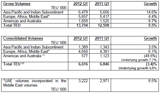 “This growth was driven by an excellent performance in our Asia Pacific and Indian Subcontinent region which reported 14.6% growth in volumes as new capacity across the region supported strong growth across our Asia Pacific portfolio. Growth in Europe, Middle East and Africa region was 4.4% with a good performance in the Middle East and Africa mitigating the ongoing challenging operating environment in Europe. The Americas and Australia region reported growth of 8.7% driven by a very strong performance in the Americas region. “Our portfolio of consolidated terminals reported container volumes of 6.6 million TEU. Had our five terminals in Australia not been deconsolidated from the 12 March 2011, underlying growth would have been 5.9% when compared to the same period last year. “Jebel Ali, UAE has continued to deliver strong volume growth handling 3.2 million TEU in the first three months of the year, 8.5% ahead of the same period last year. “The global macroeconomic uncertainty has continued into 2012. With our portfolio focused on the faster growing emerging markets and more stable origin and destination (O&D) markets, we remain committed to delivering improved operational and financial performance over 2011”. The voting results for all of the AGM resolutions will be available on the London Stock Exchange, Nasdaq Dubai and www.dpworld.com after the AGM. Volumes for Q1 2012
