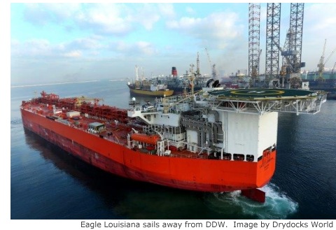 The amount of steel used for the Eagle Louisiana project is 2530 tonnes with 19.68 km of pipes and electrical cables of 292 km also utilized. The MCVs will individually have 700,000 barrels of liquid storage capacity, and can process, store and offload the liquids to shuttle tankers. The process equipment will separate the liquids from gas, safely store the liquids and flare the gas. Then the liquids will be offloaded to shuttle tankers which will transport the liquids to shore. With the delivery of the MCVs, Drydocks World has created a name for itself in sophisticated vessel conversions.