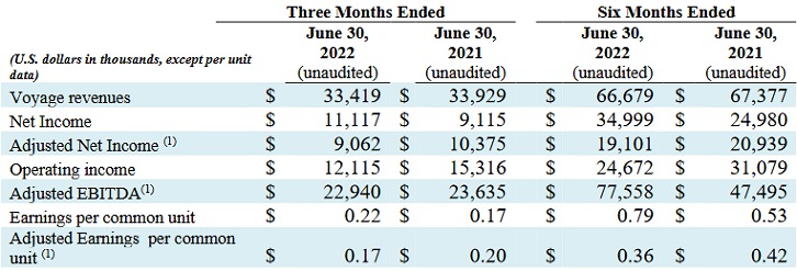 (1) Adjusted Net Income, Adjusted EBITDA and Adjusted Earnings per common unit are not recognized measures under U.S. GAAP. Please refer to Appendix B of this press release for the definitions and reconciliation of these measures to the most directly comparable financial measures calculated and presented in accordance with U.S. GAAP. Three Months Ended June 30, 2022 and 2021 Financial Results Net Income for the three months ended June 30, 2022 was $11.1 million as compared to a Net Income of $9.1 million for the corresponding period of 2021, which represents an increase of $2.0 million, or 22.0%. The increase in net income for the three months ended June 30, 2022 was mainly attributable to the increase in the gain on our interest rate swap transaction compared to the corresponding period of 2021, which was partly offset by an increase in the vessels dry-docking and special survey costs, attributable to the scheduled dry-docks of the Clean Energy and the Amur River, which commenced on March 16, 2022 and June 25, 2022, respectively. Adjusted Net Income for the three months ended June 30, 2022 was $9.1 million compared to $10.4 million for the corresponding period of 2021, which represents a net decrease of $1.3 million or 12.5%. This decrease is mainly attributable to the decrease in the vessels’ revenue, as well as to the increase of interest and finance costs compared to the corresponding period of 2021. Voyage revenues for the three months ended June 30, 2022 were $33.4 million as compared to $33.9 million for the corresponding period of 2021, which represents a net decrease of $0.5 million or 1.5%, which is mainly attributable to the decrease in the revenue earning days for the three months ended June 30, 2022 compared to the corresponding period of 2021, due to the abovementioned scheduled dry-docks of the Clean Energy and the Amur River. The Partnership reported average daily hire gross of commissions(1) of approximately $62,860 per day per vessel in the three-month period ended June 30, 2022, compared to approximately $62,440 per day per vessel for the corresponding period of 2021. During both three-month periods ended June 30, 2022 and June 30, 2021, the Partnership’s vessels operated at 100% utilization. Vessel operating expenses were $7.4 million, which corresponds to a daily rate per vessel of $13,588 in the three-month period ended June 30, 2022, as compared to $7.6 million, or a daily rate per vessel of $13,945 in the corresponding period of 2021. This decrease is mainly attributable to lower planned technical maintenance and crewing costs on the Partnership’s vessels in the three months period ending June 30, 2022 compared to the corresponding period in 2021. Adjusted EBITDA for the three months ended June 30, 2022 was $22.9 million, as compared to $23.6 million for the corresponding period of 2021. The decrease of $0.7 million, or 3.0%, was mainly attributable to the effect of the decrease in revenues of the Clean Energy and the Amur River due to the off hire period during their scheduled dry-dock in the three months ended June 30, 2022. Interest and finance costs, net were $6.0 million in the three months ended June 30, 2022 as compared to $5.4 million in the corresponding period of 2021, which represents an increase of $0.6 million, or 11.1% due to the increase in the weighted average interest rate in the three months period ending June 30, 2022, compared to the corresponding period in 2021, which was partly counterbalanced by the reduction in interest bearing debt as compared to the corresponding period of 2021. For the three months ended June 30, 2022, the Partnership reported basic and diluted Earnings per common unit and Adjusted Earnings per common unit, of $0.22 and $0.17 respectively, after taking into account the distributions relating to the Series A Preferred Units and the Series B Preferred Units on the Partnership’s Net income/Adjusted Net Income. Earnings per common unit and Adjusted Earnings per common unit, basic and diluted, are calculated on the basis of a weighted average number of 36,802,247 common units outstanding during the period and in the case of Adjusted Earnings per common unit after reflecting the impact of the non-cash items presented in Appendix B of this press release. Adjusted Net Income, Adjusted EBITDA and Adjusted Earnings per common unit are not recognized measures under U.S. GAAP. Please refer to Appendix B of this press release for the definitions and reconciliation of these measures to the most directly comparable financial measures calculated and presented in accordance with U.S. GAAP. Amounts relating to variations in period–on–period comparisons shown in this section are derived from the condensed financials presented below. (1) Average daily hire gross of commissions represents voyage revenue excluding the non-cash time charter deferred revenue amortization, divided by the Available Days in the Partnership’s fleet as described in Appendix B Liquidity/ Financing/ Cash Flow Coverage During the three months ended June 30, 2022, the Partnership generated net cash from operating activities of $8.2 million as compared to $15.8 million in the corresponding period of 2021, which represents a decrease of $7.6 million, or 48.1% mainly as a result of working capital changes. As of June 30, 2022, the Partnership reported total cash of $100.2 million (including $50.0 million of restricted cash). The Partnership’s outstanding indebtedness as of June 30, 2022 under the $675.0 Million Credit Facility amounted to $543.0 million, gross of unamortized deferred loan fees and including $48.0 million, which was repayable within one year. As of June 30, 2022, the Partnership had unused availability of $30.0 million under its interest free $30.0 million revolving credit facility with its Sponsor, or the $30.0 Million Revolving Credit Facility, which was extended on November 14, 2018, and is available to the Partnership at any time until N