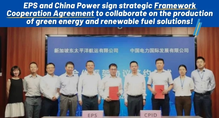 24 July 2023 Eastern Pacific Shipping Pte. Ltd.(EPS), and China Power International Development Limited signed a Framework Cooperation Agreement (FCA) to collaborate on the production of green energy and renewable fuel solutions. This partnership marks an important milestone in pursuing a cleaner, more sustainable future for the maritime and power generation industries. Under the FCA, EPS and China Power, tapping on their expertise in green energy production, storage, and transportation, will cooperate to advance the development and adoption of energy solutions for the maritime industry, including green ammonia and green methanol. Both companies recognise the pressing need to transition towards low-carbon alternatives, and this collaboration will enable them to leverage their respective strengths to accelerate progress in this vital area. Representing EPS at the signing was Commercial Director Mr. Tay Gak Yong, who expressed his gratitude to China Power and stated, "The signing is a historic starting point that will strengthen the communication and strategic cooperation between our two organisations. Our framework agreement will lay the groundwork for expanding joint efforts towards market development to promote the adoption of sustainable energy solutions. By leveraging our combined expertise, we aim to unlock new opportunities, drive innovation, and deliver tangible solutions that address the pressing global challenges of maritime decarbonisation and sustainability. EPS looks forward to working with China Power to develop mutually synergistic solutions that will ultimately benefit the entire maritime industry." The FCA comes at a time when the impetus for alternative marine fuel and power generation solutions are at an all time high. Various government mandates and ambitious corporate social responsibility agendas have made it clear that sustainability efforts must be accelerated. The FCA aims to provide both industries with viable and scalable solutions that will aide in global decarbonisation and environmental preservation. Also in attendance to commemorate the signing were Mr. Gao Ping, President of China Power and Deputy Party Committee Secretary; Mr. Lin Qing Shan, Deputy General Manager of Jiangnan Shipbuilding (Group) Co., Ltd.; Mr Wang Jun Jie, Deputy General Manager of China Power; Mr Guo Cong, Adviser, China Shipbuilding Trading Co., Ltd.; Ms Liu Yuan Qin, Senior Manager of China Power; Mr. Dan Kwek, Manager Sales and Purchase of EPS; and Mr. Andy Wang, Chartering Manager, Dry Bulk of EPS.