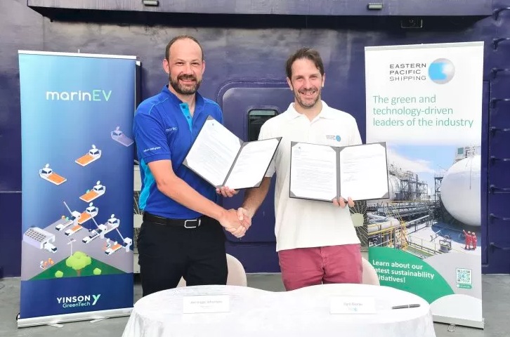 Singapore - 18 April 2024 Yinson GreenTech (YGT), a leading green technology solutions provider, has signed a Letter of Intent (LOI) with Eastern Pacific Shipping (EPS), a global leader in maritime transportation, during Singapore Maritime Week 2024. This collaboration, spearheaded by YGT's marine electrification business, marinEV, marks a significant step towards cleaner and more sustainable maritime operations in Singapore, with the following key milestones on the horizon: Pioneering electric vessel deployments • First cargo delivery with an electric vessel in the Port of Singapore: marinEV and EPS aim to be at the forefront of maritime history by jointly facilitating the first cargo delivery using an electric vessel within the Port of Singapore. This aligns with both companies' commitment to environmental responsibility and demonstrates their dedication to creating a net zero world. • First crew transfer with an electric vessel in Singapore: Recognising the critical role of crew transfers in maritime operations, marinEV and EPS will collaborate on the first crew transfer conducted by an electric vessel in Singapore. This trial will provide valuable data on the feasibility, efficiency, and safety of electric vessels for crew transportation, paving the way for wider industry adoption. Collaborating for a greener future • Building upon their commitment to sustainability, marinEV will enter into a collaborative agreement with EPS. This partnership aims to integrate electric vessels into last-mile delivery operations, significantly reducing Scope 3 emissions and contributing to a cleaner shipping industry. By jointly defining ambitious emission reduction goals, marinEV and EPS will work together to create a more sustainable future for maritime transportation. "At Yinson GreenTech, we believe that collaboration is key to unlocking a cleaner future for our oceans. Our partnership with Eastern Pacific Shipping on these groundbreaking electric vessel deployments in Singapore signifies a major leap forward," said Jan-Viggo Johansen, Managing Director of marinEV. "Together, we are not only making history but also paving the way for a future where clean and efficient transportation solutions become the norm. This is an exciting moment for us, and we are committed to working closely with EPS, our existing partners and other industry leaders to achieve a truly sustainable maritime landscape." "It is heartening to see like-minded partners in the industry adopt the "act now" approach like us, taking action and exploring innovative solutions on all fronts," said Cyril Ducau, Chief Executive Officer of EPS. "This collaboration with Yinson GreenTech not only offers a greener transportation alternative, it also builds on the industry's collective commitment to accelerate the decarbonisation of shipping. We don't do things because they are easy. We do it because they are difficult so that we leave no stones unturned in our efforts to decarbonise."