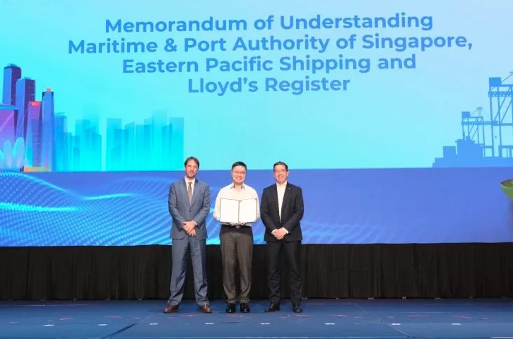 From left to right: Cyril Ducau, CEO, Eastern Pacific Shipping; Teo Eng Dih, Chief Executive, MPA; Nicholas Brown, CEO, Lloyd's Register. Image by Eastern Pacific Shipping. Eastern Pacific Shipping - press release