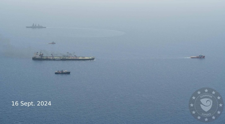 16 September 2024 Under protection of EUNAVFOR ASPIDES, MV Sounion has been successfully towed to a safe area without any oil spill. While private stakeholders complete the salvage operation, ASPIDES will continue to monitor the situation. The completion of this phase of the salvage operation is the result of a comprehensive approach and close cooperation between all stakeholders committed to prevent an environmental disaster affecting the whole region. Acting as a credible EU maritime security provider, EUNAVFOR ASPIDES continues to contribute to the freedom of navigation in the area of operation and the protection of seafarers' lives and global common goods.