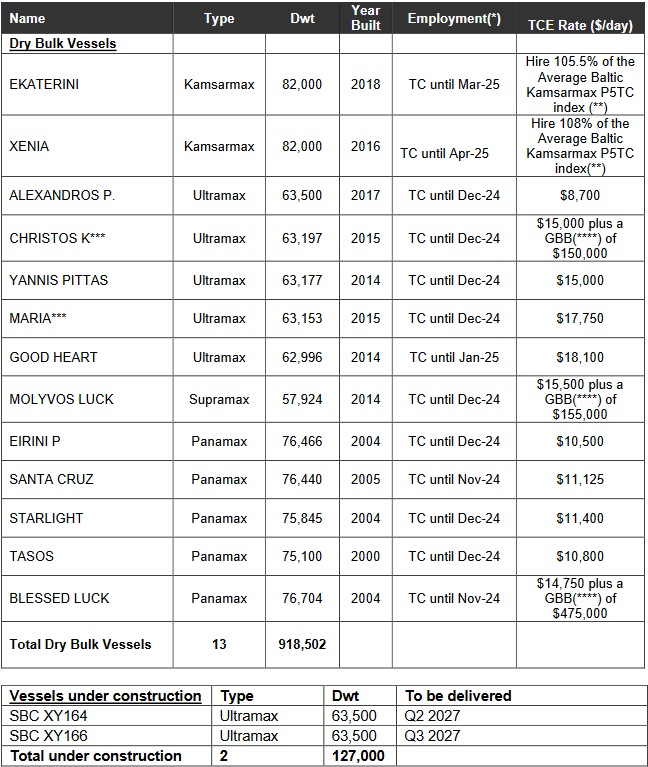 Athens, Greece - November 21, 2024 EuroDry Ltd. (NASDAQ: EDRY, the "Company" or "EuroDry"), an owner and operator of drybulk vessels and provider of seaborne transportation for drybulk cargoes, announced today that it has signed a contract with Nantong Xiangyu Shipbuilding for the construction of two 63,500 DWT ultramax bulk carriers. Both vessels are geared, eco, and are built to EEDI phase 3 design standard. The two newbuildings are scheduled to be delivered during the second and third quarters of 2027. The total consideration for the two newbuilding contracts is approximately $71.8 million and will be financed with a combination of debt and equity. Aristides Pittas, Chairman and CEO of EuroDry commented: "We are pleased to announce the ordering of two geared 63,500 DWT ultramax vessels. The addition of two modern Ultramax vessels in our fleet will solidify our presence in the Supra/Ultramax segment by increasing our fleet in this segment to eight vessels all with eco type engines and environmentally friendly footprint. These contracts reflect our Company's commitment to growing and modernizing our fleet and also highlight our focus on generating returns to our shareholders through timely and accretive investments." Fleet Profile: The EuroDry Ltd. fleet profile is as follows: