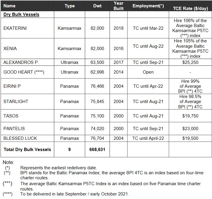 Athens, Greece - August 23, 2021 EuroDry Ltd. (NASDAQ: EDRY, the “Company” or “EuroDry”), an owner and operator of drybulk vessels and provider of seaborne transportation for drybulk cargoes, announced today that it has agreed to acquire M/V Asia Ruby II, a 62,996 dwt drybulk vessel built in 2014, for $24.5 million. The vessel is expected to be delivered to the Company within late September / early October 2021 and will be renamed M/V Good Heart. The acquisition will be financed by own funds and a bank loan. Aristides Pittas, Chairman and CEO of EuroDry commented: “We are pleased to announce the acquisition of M/V Asia Ruby II, an Ultramax, drybulk carrier built in 2014. This acquisition further expands our modern fleet cluster at a time when the market fundamentals are very supportive of charter rates. At current market rates, we expect that M/V Ruby II will make a significant contribution to our net income and EBITDA. As we stated recently, we believe that a number of factors constraining vessel supply in the near term combined with one of the lowest orderbook levels ever and a healthy demand growth are likely to result in strong rates for drybulk vessels well into 2022 and beyond. This acquisition allows us to better position ourselves to take advantage of such developments. Furthermore, the modernization and growth of our fleet further increases our stature as a public company enhancing the value of our public listing.” Fleet Profile: After the delivery of the M/V Ruby Asia II, the EuroDry Ltd. fleet profile will be as follows: