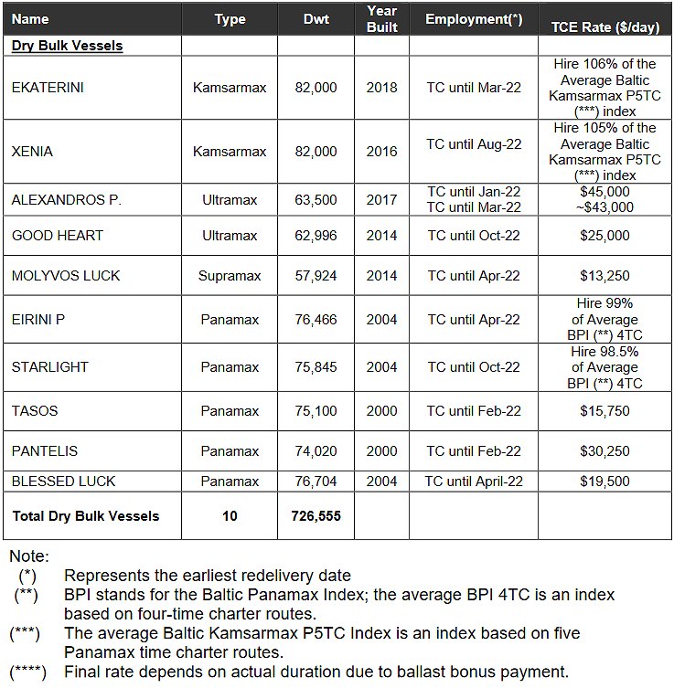 Athens, Greece - January 19, 2022 EuroDry Ltd. (NASDAQ: EDRY, the “Company” or “EuroDry”), an owner and operator of drybulk vessels and provider of seaborne transportation for drybulk cargoes, announced today that it has agreed to acquire M/V Molyvos Luck, a 57,924 dwt drybulk vessel built in 2014, for $21.2 million. The vessel was majority owned by an un-affiliated third party and has been managed by Eurobulk Ltd., also the manager of the majority of the Company’s vessels. The vessel is expected to be delivered to the Company around the end of January 2022. The Company will also assume the existing charter of the vessel at $13,250/day until April 2022. The acquisition will be initially financed by the Company’s own funds; a bank loan will be arranged to partly finance the acquisition after the purchase is completed. Aristides Pittas, Chairman and CEO of EuroDry commented: “We are pleased to announce the acquisition of M/V Molyvos Luck, a Supramax, drybulk carrier built in 2014. This acquisition further expands our modern fleet cluster at a time when the market fundamentals are very supportive of a continuing strong market as there are signs that the pandemic may recede and fleet growth is expected to be limited as evidenced by the historically low levels of the orderbook. At current market rates, we expect that M/V Molyvos Luck will make a significant contribution to our net income and EBITDA. The accumulation of funds that our fleet generates provides us with several investment, expansion or other shareholder reward options and we will continue pursuing those most appropriate for the benefit of our shareholders at any given point.” Fleet Profile: After the delivery of the M/V Molyvos Luck, the EuroDry Ltd. fleet profile will be as follows: