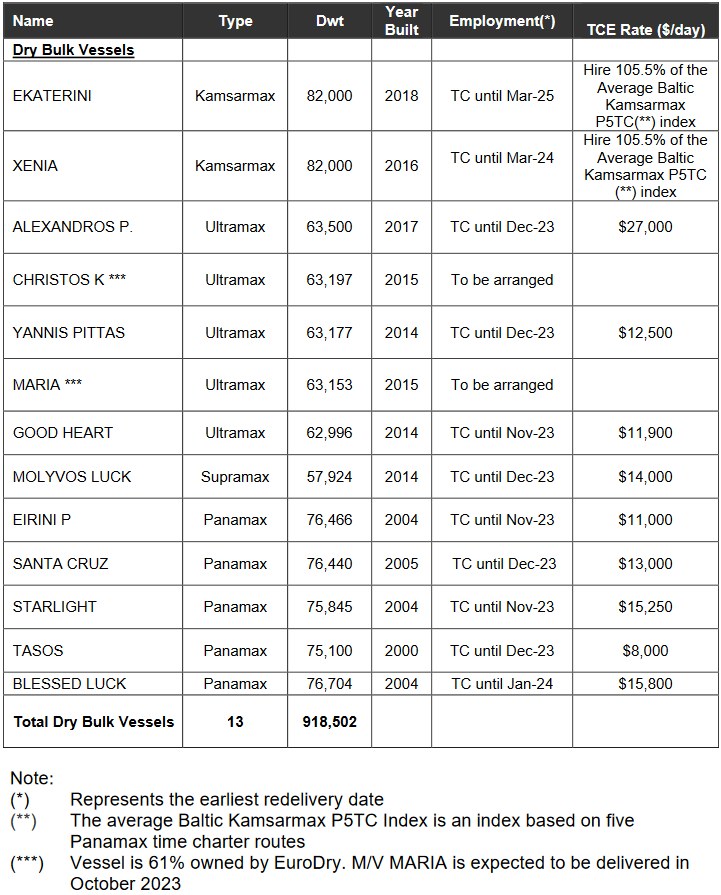 Athens, Greece - October 26, 2023 EuroDry Ltd. (NASDAQ: EDRY, the "Company" or "EuroDry"), an owner and operator of drybulk vessels and provider of seaborne transportation for drybulk cargoes, announced today that it formed a joint venture with a number of investors represented by NRP Project Finance AS ("NRP Investors") regarding the ownership of the two Ultramax vessels it recently announced its agreement to acquire, M/V Christos K (ex - Giants Causeway) and M/V Maria (ex-Sadlers Wells), both built in 2015. Specifically, NRP Investors will acquire a 39% ownership stake in each of the vessels. Furthermore, the Company announced today that it took delivery of one of the above vessels, M/V Christos K, a 63,197 dwt. The Company has arranged a sustainability-linked loan of $11 million with Eurobank S.A. to partly finance the acquisition. Aristides Pittas, Chairman and CEO of EuroDry commented: "We are very pleased to partner with the NRP team, a Norwegian investment and project finance firm, and we are excited to announce our joint venture with investors represented by NRP. This joint venture transaction helps us fund our fleet growth strategy in a non-dilutive way to our shareholders. It also allows us to broaden our investor base and establish a presence in a highly reputable and experienced shipping market. In parallel, we are also pleased to welcome M/V Christos K into our family, further increasing the "eco" cluster of our fleet. We look forward to continuing looking for accretive transactions and ways to finance our growth creating value for our shareholders." Fleet Profile: Assuming the delivery of the three Eco Ultramax drybulk vessels described above, the EuroDry Ltd. fleet profile would be as follows:
