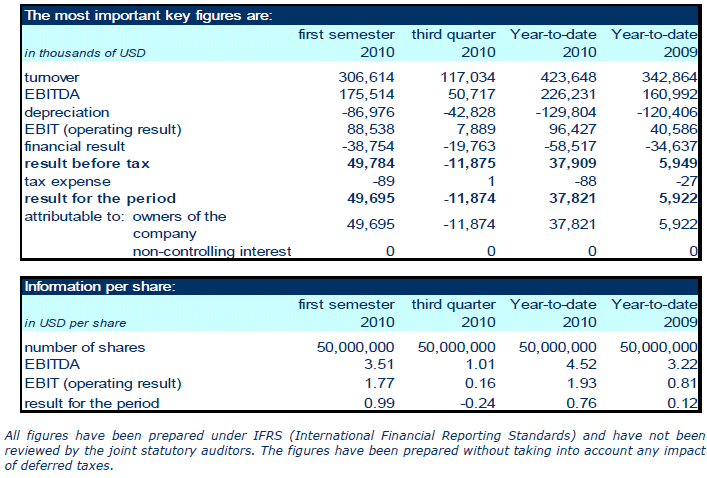 For the third quarter 2010: the average daily time charter equivalent rates (TCE) obtained by the company’s VLCC fleet in the Tankers International pool was approximately USD 30,900 per day (third quarter 2009: USD 23,100 per day). The time charter equivalent earnings of the Euronav Suezmax fleet fixed on long term time charters, including profit shares when applicable, was USD 28,000 per day (third quarter 2009: USD 29,300 per day) and the average daily TCE rates obtained by the Suezmax spot fleet was approximately USD 12,000 per day. In the third quarter, Euronav took the decision to leave some of its Suezmaxes idle for an equivalent aggregate of 76 days. The rates being offered in the market were so low that employing a vessel on medium to long length voyages added no value. The forgone revenue could be easily regained by employing the ships later at even a marginally higher rate. “I do not understand other owners employing their vessels sailing on round trip voyages with all attendant liabilities at rates that pay no more or even less than the expenses of the voyage” said Paddy Rodgers CEO of Euronav. The result of the third quarter is positively affected by the revaluation at marked-to-market levels of non cash items such as hedge instruments on interest rates for a total of USD 2.5 millions. It has to be noted however that the interest rate swap (IRS) agreement which is related to the FSO Africa loan does not longer qualify as a hedge instrument under IFRS and will therefore be marked-to-market directly in the profit and loss accounts as from this publication of results. Euronav fleet On 12 October 2010, the company has delivered its oldest double hulled VLCC tanker, the TI Creation (1998 – 298,324 dwt), to its new owner. The company fixed its Suezmax vessels Cap Leon (2003 – 159,048 dwt) and Cap Laurent (1998 – 146,646 dwt) on time charter contract to Valero for a period of 36 and 42 months respectively. Tanker market Since the end of the second quarter, the freight market for seaborne transportation of crude oil has been very volatile but in a low range of freight rates. This can mainly be explained by two factors in particular, a much lower amount of VLCCs being used as floating storage and changes in trading patterns especially for crude oil moving to the Far East. These two factors have led to the current overhang of available tonnage in the market affecting both VLCC and Suezmax freight rates. Outlook Since the beginning of 2010 the global oil demand rebounded a strong 2.6% and, according to IEA, oil demand is set to grow by 2%-3% yearly between 2011 and 2015. This increase in demand has been mainly supported by fast growing economies such as Asia, Middle East and Latin America. The increase in demand of crude oil and, as a result the potential increase in demand of transportation should gradually absorb the newbuildings entering the market in 2011 and 2012. So far in the fourth quarter, Euronav VLCC fleet operated in the tankers International pool has earned USD 18,250 per day and 42% of the available days have been fixed. These rates remain low for this time of the year. However the market should rebound as the winter season usually triggers an increase in demand for crude oil. Management remains cautious in respect of the outlook for the rest of the year and for 2011. About Euronav Euronav is one of the world's leading independent tanker companies engaged in the ocean transportation and storage of crude oil and petroleum products. The company is headquartered in Antwerp, Belgium, and has offices throughout Europe and Asia. Euronav is listed on NYSE Euronext Brussels under the symbol EURN. Euronav employs its fleet both on the spot and period market. Vessels on the spot market are traded in the Tankers International pool of which Euronav is one of the major partners. Euronav’s owned fleet, one of the youngest in the industry, consists of 41 double hulled vessels being 1 V-Plus, 2 FSO vessels (both owned in 50%-50% joint venture), 12 VLCCs, 19 Suezmaxes, 1 VLCC and 5 Suezmax vessels (of which 3 in JV) under construction. Euronav vessels fly Belgian, Greek and French flag. More detailed information can be found on the company’s website : www.euronav.com Euronav NV press release |