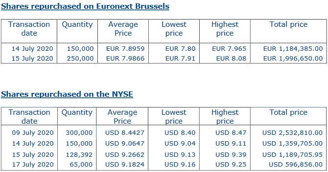 Antwerp, Belgium - 20 July 2020 Euronav NV (NYSE: EURN & Euronext: EURN) (“Euronav” or the “Company”) announces that the Company has purchased on the NYSE and on Euronext Brussels a total of 1,043,392 of its own shares for an aggregate price of EUR 8,252,540 (USD 9,241,194) as part of its capital allocation strategy and returns to shareholder policy. Following these transactions, the Company now owns 9.368.716 shares (4.26% of the total outstanding share count). Further detail on these transactions are as follows: