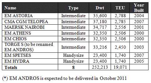 With the acquisition of M/V TORGE S, Euromar will have purchased eight geared containerships with an average age of approximately 7.9 years. As of September 26, 2011, Euromar's fleet profile is as follows: