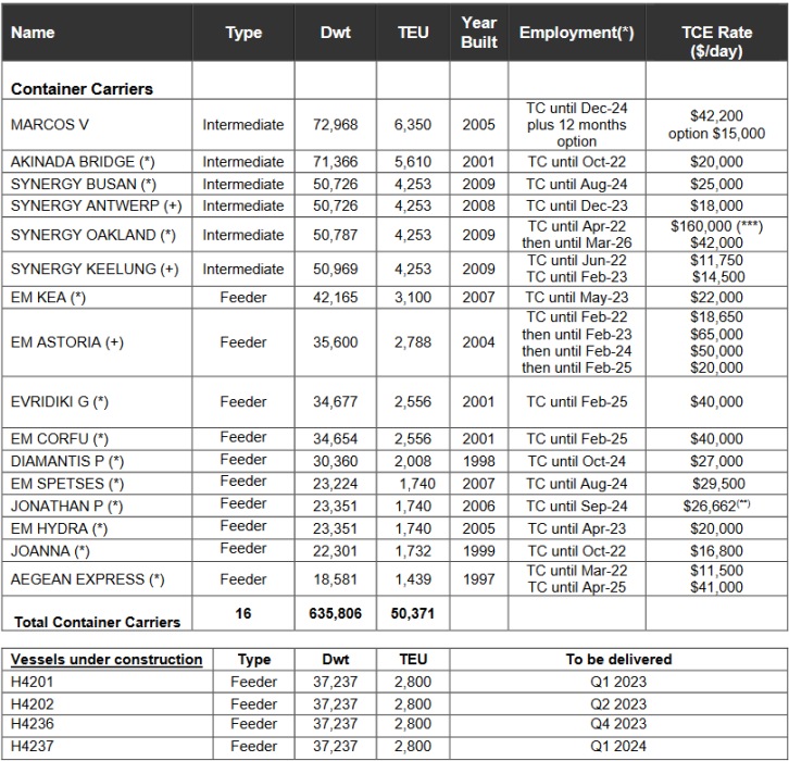 Notes: (*) TC denotes time charter. Charter duration indicates the earliest redelivery date; all dates listed are the earliest redelivery dates under each TC unless the contract rate is lower than the current market rate in which cases the latest redelivery date is assumed; vessels with the latest redelivery date shown are marked by (+). (**) Rate is net of commissions (which are typically 5-6.25%) (***) The previous charter of M/V Synergy Oakland of $202,000/day exceeded its maximum duration by about 25 days due to port delays with payment of the higher ($202,000/day) rate to the Company continuing during the extension. However, the extension resulted in the loss of the subsequent short term charter of $130,000/day that was to be performed before the 4-year charter starts. The vessel, after an idle period of 15 days, was chartered for a single voyage charter at $160,000/day after the completion of which it will commence the 4-yr charter; the new charter arrangements will result in about the same average rate and total revenues as the original arrangements. About Euroseas Ltd.
