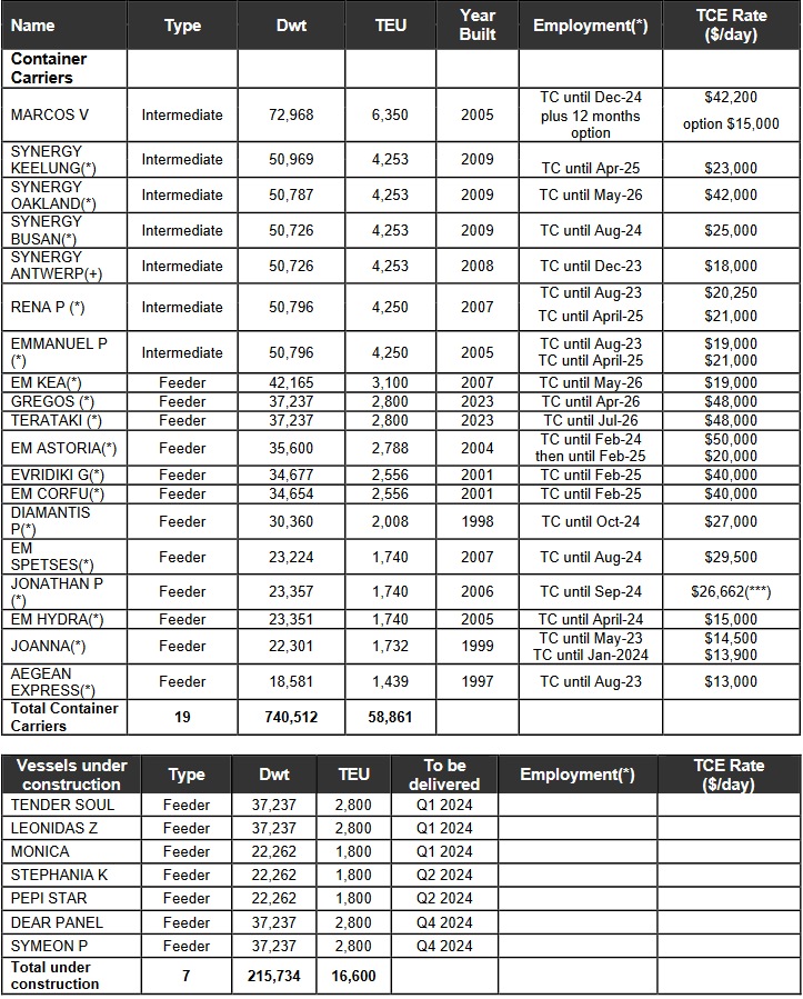 (*) TC denotes time charter. All dates listed are the earliest redelivery dates under each time charter unless the contract rate is lower than the current market rate in which cases the latest redelivery date is assumed; vessels with the latest redelivery date shown are marked by (+). (**) The CONTEX (Container Ship Time Charter Assessment Index) has been published by the Hamburg and Bremen Shipbrokers' Association (VHBS) since October 2007. The CONTEX is a company-independent index of time charter rates for container ships. It is based on assessments of the current day charter rates of six selected container ship types, which are representative of their size categories: Type 1,100 TEU and Type 1,700 TEU with a charter period of one year, and the Types 2,500, 2,700, 3,500 and 4,250 TEU all with a charter period of two years. (***) Rate is net of commissions (commissions are, typically, 5-6.25%) About Euroseas Ltd. Euroseas Ltd. was formed on May 5, 2005 under the laws of the Republic of the Marshall Islands to consolidate the ship owning interests of the Pittas family of Athens, Greece, which has been in the shipping business over the past 150 years. Euroseas trades on the NASDAQ Capital Market under the ticker ESEA. Euroseas operates in the container shipping market. Euroseas' operations are managed by Eurobulk Ltd., an ISO 9001:2008 and ISO 14001:2004 certified affiliated ship management company, which is responsible for the day-to-day commercial and technical management and operations of the vessels. Euroseas employs its vessels on spot and period charters and through pool arrangements. The Company has a fleet of 19 vessels, including 12 Feeder and 7 Intermediate containerships. Euroseas 19 containerships have a cargo capacity of 58,861 teu. The Company also has 7 Feeder containerships under construction with deliveries scheduled in 2024. On a fully-delivered basis of its vessels under construction, the Company’s fleet will increase to 26 containerships with a cargo capacity of about 75,461 teu. Euroseas Ltd. Press Release
