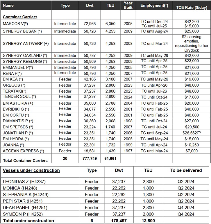 (*) TC denotes time charter. All dates listed are the earliest redelivery dates under each time charter unless the contract rate is lower than the current market rate in which cases the latest redelivery date is assumed; vessels with the latest redelivery date shown are marked by (+). (**) Rate is net of commissions (which are typically 5-6.25%) Full report About Euroseas Ltd. Euroseas Ltd. was formed on May 5, 2005 under the laws of the Republic of the Marshall Islands to consolidate the ship owning interests of the Pittas family of Athens, Greece, which has been in the shipping business over the past 140 years. Euroseas trades on the NASDAQ Capital Market under the ticker ESEA. Euroseas operates in the container shipping market. Euroseas' operations are managed by Eurobulk Ltd., an ISO 9001:2008 and ISO 14001:2004 certified affiliated ship management company, which is responsible for the day-to-day commercial and technical management and operations of the vessels. Euroseas employs its vessels on spot and period charters and through pool arrangements. The Company has a fleet of 20 vessels, including 13 Feeder containerships and 7 Intermediate containerships. Euroseas 20 containerships have a cargo capacity of 61,661 teu. After the delivery of six feeder containership newbuildings in 2024, Euroseas' fleet will consist of 26 vessels with a total carrying capacity of 75,461 teu. Euroseas Ltd. Press Release