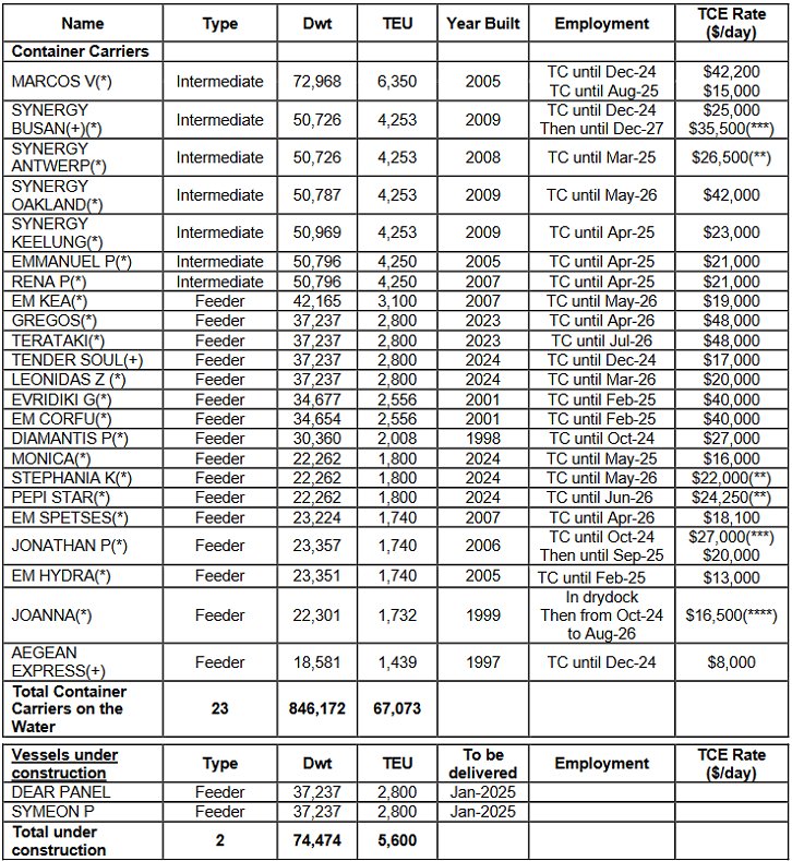 Maroussi, Athens, Greece - October 7, 2024 Euroseas Ltd. (NASDAQ: ESEA, the "Company" or "Euroseas"), an owner and operator of container carrier vessels and provider of seaborne transportation for containerized cargoes, announced today a time charter contract for its 1,732 teu feeder containership, M/V Jonathan P, for a minimum period of 11 to a maximum period of 13 months at the option of the charterer, at a gross daily rate of $20,000. The new charter will commence after the completion of her scheduled intermediate survey, expected around mid-to-end of October 2024. Aristides Pittas, Chairman and CEO of Euroseas commented: "We are pleased to announce that our 18-year-old M/V Jonathan P has been chartered with a top-class charterer for 11-13 months, at a profitable rate of $20,000/day. This fixture is a testament to the constant need for feeder ships, despite declining container freight rates. It also validates the component of our investment strategy of acquiring vessels with minimal or no residual value risk at the expiration of their initial charter, as was the case with M/V Jonathan P. The present charter is expected to contribute about 4.0 million of EBITDA for the minimum contracted period and increase our remaining 2024 charter coverage to about 96%; it also increases our charter coverage for 2025 to about 52%." Fleet Profile: The Euroseas Ltd. fleet profile is as follows: