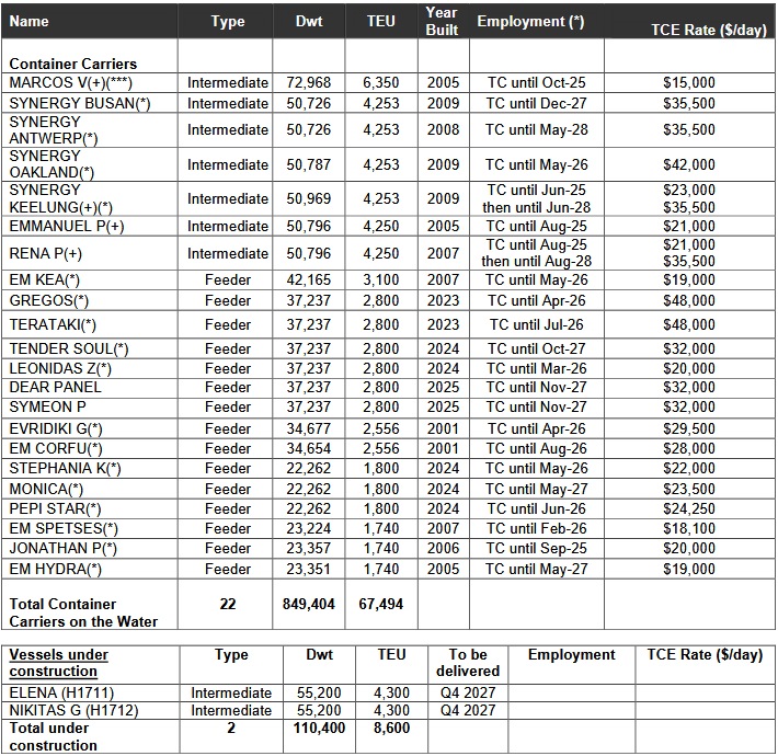 (**) Rate is net of commissions (which are typically 5-6.25%) (***) The vessel is sold and is expected to be delivered to its new owners in the fourth quarter of 2025 About Euroseas Ltd. Euroseas Ltd. was formed on May 5, 2005 under the laws of the Republic of the Marshall Islands to consolidate the ship owning interests of the Pittas family of Athens, Greece, which has been in the shipping business over the past 140 years. Euroseas trades on the NASDAQ Capital Market under the ticker ESEA. Euroseas operates in the container shipping market. Euroseas' operations are managed by Eurobulk Ltd., an ISO 9001:2008 and ISO 14001:2004 certified affiliated ship management company, which is responsible for the day-to-day commercial and technical management and operations of the vessels. Euroseas employs its vessels on spot and period charters and through pool arrangements. The Company has a fleet of 22 vessels, including 15 Feeder containerships and 7 Intermediate containerships with a cargo capacity of 67,494 teu. After the sale of M/V Marcos V and the delivery of the two intermediate containership newbuildings in 2027, Euroseas’ fleet will consist of 23 vessels with a total carrying capacity of 69,744 teu. Euroseas Ltd. Press Release