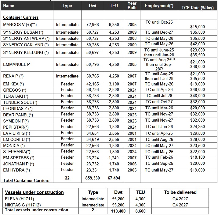 Note: (*) TC denotes time charter. All dates listed are the earliest redelivery dates under each TC unless the contract rate is lower than the current market rate in which cases the latest redelivery date is assumed; vessels with the latest redelivery date shown are marked by (+). (**) The vessel was sold to an unaffiliated third party. The vessel is scheduled to be delivered to its buyer in October 2025. Full report About Euroseas Ltd. Euroseas Ltd. was formed on May 5, 2005 under the laws of the Republic of the Marshall Islands to consolidate the ship owning interests of the Pittas family of Athens, Greece, which has been in the shipping business over the past 140 years. Euroseas trades on the NASDAQ Capital Market under the ticker ESEA. Euroseas operates in the container shipping market. Euroseas' operations are managed by Eurobulk Ltd., an ISO 9001:2008 and ISO 14001:2004 certified affiliated ship management company, which is responsible for the day-to-day commercial and technical management and operations of the vessels. Euroseas employs its vessels on spot and period charters and through pool arrangements. The Company has a fleet of 22 vessels, including 15 Feeder containerships and 7 Intermediate containerships. Euroseas 22 containerships have a cargo capacity of 67,494 teu. After the delivery of two intermediate containership newbuildings in the fourth quarter of 2027, Euroseas' fleet will consist of 24 vessels with a total carrying capacity of 76,094 teu. Euroseas Ltd. Press Release