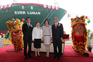 December 26, 2014 Evergreen Group today held the naming ceremony for EVER LUNAR, the seventh of its L-type vessels to be built by CSBC Corporation in Taiwan. The ceremony, which was officiated by Ms. Lee-Ching Ko, Second Vice Group Chairman of Evergreen Group, took place at CSBC's Kaohsiung shipyard. The official rope-cutting of the new 8,508 TEU vessel was performed by Mrs. Lin, Mei-Chun. EVER LUNAR is owned by Evergreen Marine Corporation (Taiwan) Ltd. The ship is 334.8 meters in length, 45.8 meters wide and has a draft of 14.2 meters. In common with its L-type sister ships, EVER LUNAR can cruise at speeds up to 24.5 knots. The ship will be delivered into service in January and join Evergreen Line's Far East - Arabian Persian Gulf (APG) Service. Speaking at the ceremony, Ms. Ko said, "Evergreen has taken delivery of six L-type vessels from CSBC, assisting in our on-going fleet renewal program, which is enhancing our competitiveness and operating performance. The name of this new ship is symbolic of a shining outlook for the container shipping market. We are confident that our business can benefit from recent forecast of market growth and that such momentum will contribute to an increase in profitability ." Evergreen Line commenced its fleet renewal program in 2010. The project entailed ordering twenty L-type vessels from Samsung Heavy Industries and another ten units of the same specifications from CSBC. The Samsung building program was concluded in July this year. The delivery of EVER LUNAR will add the 27th such vessel to Evergreen's operating fleet. The remaining three ships will be delivered by the third quarter of 2015 and be balanced by the redelivery of vessels currently on charter when the charter periods expire. In addition to the fleet renewal program, Evergreen is consolidating its service cooperation with strategic partners, including those in the CKYHE alliance to provide a more comprehensive service and to strengthen its competitiveness. Evergreen Marine Corp. press release |