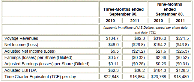 A reconciliation of the non-GAAP measures discussed above is included in a later section of this release. Third Quarter 2011 Results Excel reported voyage revenues of $82.3 million for the third quarter of 2011 compared to $104.7 million for the same period in 2010, a decrease of approximately 21.4%. Adjusted EBITDA for the third quarter of 2011 was $36.2 million compared to $62.3 million for the third quarter of 2010, a decrease of approximately 41.9%. Net loss for the quarter amounted to $26.8 million or $0.32 per weighted average diluted share compared to a net profit of $48.0 million or $0.57 per weighted average diluted share in the third quarter of 2010. The third quarter 2011 results include a non-cash unrealized loss on derivative financial instruments of $1.6 million compared to a non-cash unrealized loss on derivative financial instruments of $4.1 million in the corresponding period in 2010. In addition, the results for the three-month period ended September 30, 2011 include a non-cash gain of $5.1 million realized in connection with the sale of the M/V Lady. The above net results include also the amortization of favorable and unfavorable time charters that were recorded upon acquiring Quintana Maritime Limited (“Quintana”) on April 15, 2008 amounting to a net loss of $9.2 million and a net gain of $42.5 million for the third quarter of 2011 and 2010, respectively. There was an adjusted net loss, excluding all the above items, of $21.2 million or $0.25 per weighted average diluted share for the third quarter of 2011 compared to an adjusted net income, excluding all the above items, of $9.5 million or $0.11 per weighted average diluted share for the same quarter of 2010. The above adjusted net results also include the amortization of stock based compensation expense of $4.6 million and $5.5 million, for the quarter ended September 30, 2011 and 2010, respectively. An average of 47.4 and 48 vessels were operated during the third quarter of 2011 and 2010, respectively, earning a blended average time charter equivalent rate of $16,864 and $22,848 per day, respectively. A reconciliation of adjusted EBITDA to net income, adjusted net income to net income and Adjusted Earnings (losses) per Share (Diluted) to Earnings (losses) per Share (Diluted) as well as a calculation of the TCE is provided in a later section of this press release. Nine Months Ended September 30, 2011 Results Excel reported voyage revenues of $271.5 million for the nine months ended September 30, 2011 compared to $316.0 million for the same period in 2010, a decrease of approximately 14.1%. Adjusted EBITDA for the period was $128.3 million compared to $184.3 million for the respective period of 2010, a decrease of approximately 30.4%. There was a net loss of $43.8 million or $0.52 per weighted average diluted share in the nine months ended September 30, 2011 compared to a net profit of $194.2 million or $2.36 per weighted average diluted share in the nine months ended September 30, 2010. The results for the nine month period ended September 30, 2011 include a non-cash unrealized gain on derivative financial instruments of $3.4 million compared to a non-cash unrealized loss on derivative financial instruments of $8.8 million in the corresponding period in 2010. In addition, the results for the nine month period ended September 30, 2011 include a non-cash gain of $6.4 million realized in connection with the sale of the M/V Marybelle and the M/V Lady. The above net results include also the amortization of favorable and unfavorable time charters that were recorded upon acquiring Quintana Maritime Limited (“Quintana”) on April 15, 2008 amounting to a net loss of $27.3 million and a net gain of $181.5 million for the nine month periods ended September 30, 2011 and 2010, respectively. There was an adjusted net loss, excluding all the above items, of $26.3 million or $0.31 per weighted average diluted share for the nine-month period ended September 30, 2011 compared to an adjusted net income, excluding all the above items, of $21.6 million or $0.26 per weighted average diluted share for the nine-month period ended September 30, 2010. The above adjusted net results also include the amortization of stock based compensation expense of $7.9 million and $7.4 million, for the nine months ended September 30, 2011 and 2010, respectively. An average of 47.9 and 47.6 vessels were operated during the nine months ended September 30, 2011 and 2010, respectively, earning a blended average time charter equivalent rate of $18,480 and $23,768 per day, respectively. A reconciliation of adjusted EBITDA to net income, adjusted net income to net income and Adjusted Earnings (losses) per Share (Diluted) to Earnings (losses) per Share (Diluted) as well as a calculation of the TCE is provided in a later section of this press release. Fleet developments On August 9, 2011, the M/V Lady (41,090 dwt, built in 1985) was delivered to her new owners and we recognized a non-cash gain of approximately $5.1 million as of the same date. About Excel Maritime Carriers Ltd Excel is an owner and operator of dry bulk carriers and a provider of worldwide seaborne transportation services for dry bulk cargoes, such as iron ore, coal and grains, as well as bauxite, fertilizers and steel products. Excel owns a fleet of 40 vessels, one of which, a Capesize vessel, is owned by a joint venture in which Excel holds 71.4%, and, together with seven Panamax vessels under bareboat charters, operates 47 vessels (seven Capesize, 14 Kamsarmax, 21 Panamax, two Supramax and three Handymax vessels) with a total carrying capacity of approximately 4.1 million DWT. Excel’s Class A common shares have been listed since September 15, 2005 on the New York Stock Exchange (NYSE) under the symbol EXM and, prior to that date, were listed on the American Stock Exchange (AMEX) since 1998. For more information about Excel, please go to our corporate website www.excelmaritime.com. Excel 