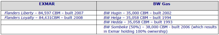 EXMAR and BW Gas have reached an agreement to swap 2 of EXMAR’s “VLGC’s” ( Very Large Gas Carrier) against the “Midsize” Fleet of BW Gas. The Vessels involved are: